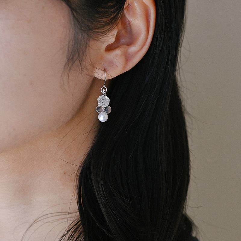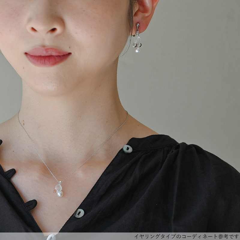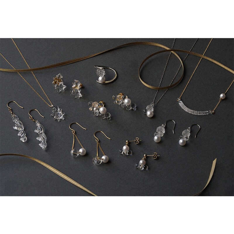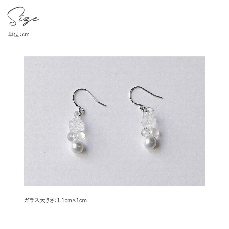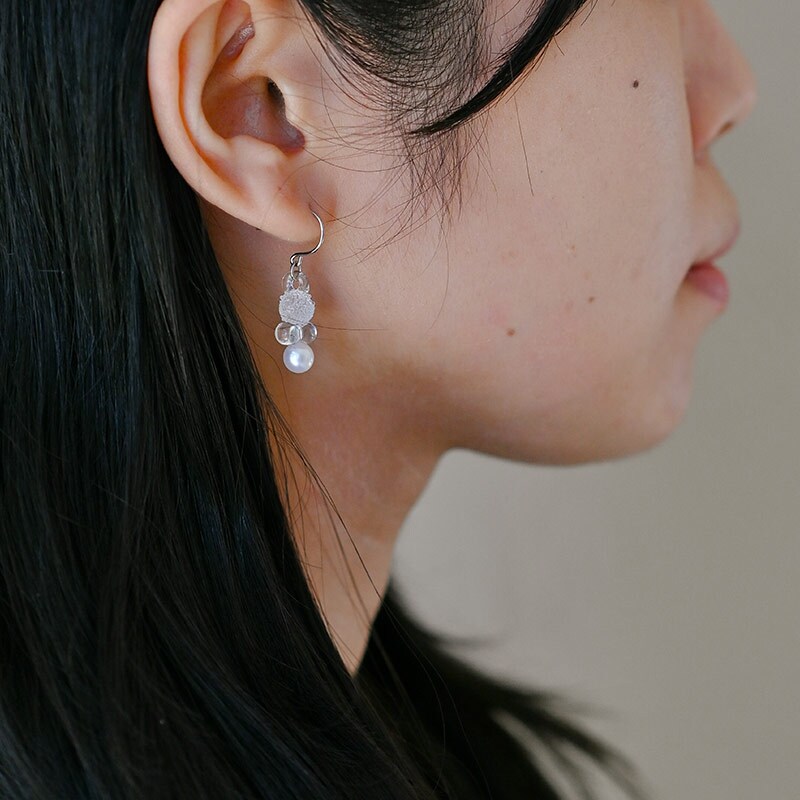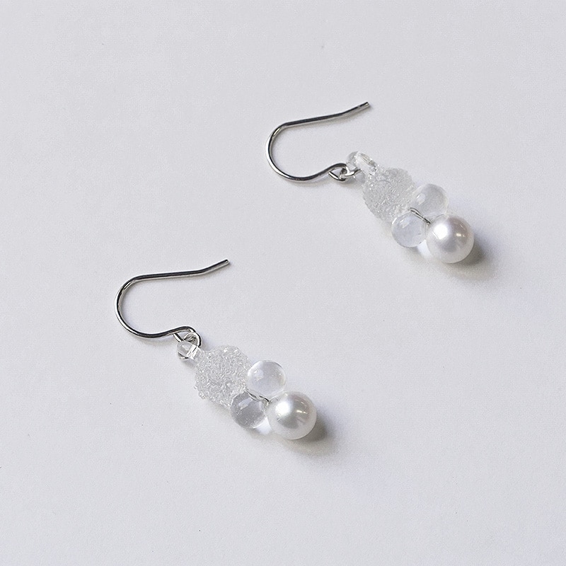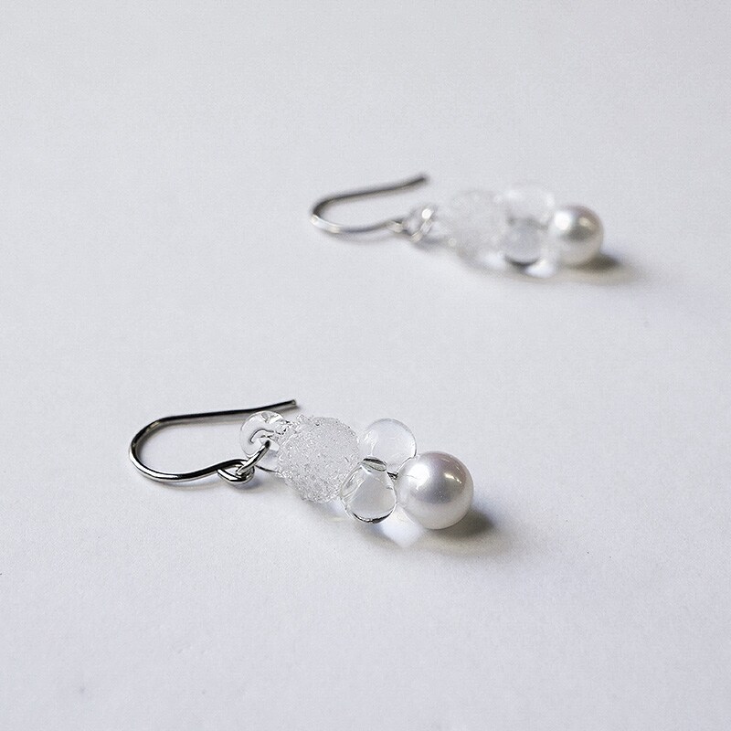 煌めきと透明感、艶やかさの3つの表情が重なり合い、印象的なフォルムを形作るピアス。ガラスとパールが織りなす幻想的な輝きをお楽しみいただけます。