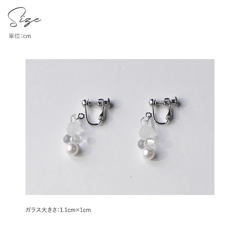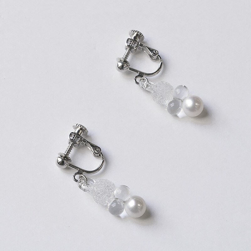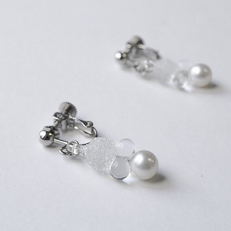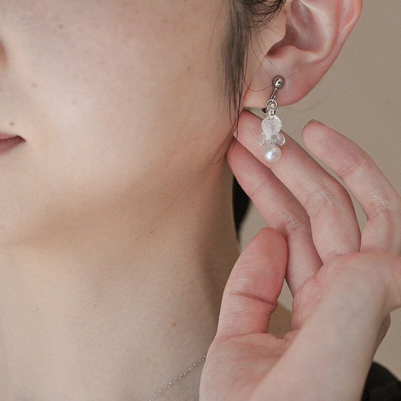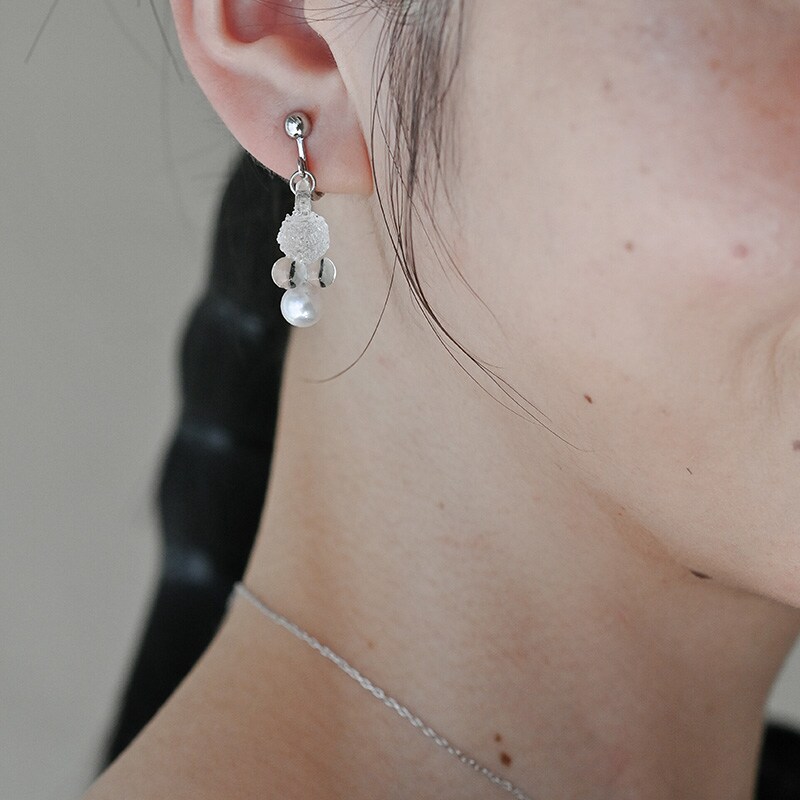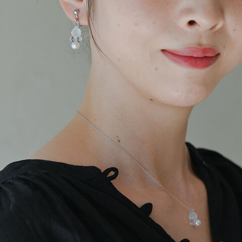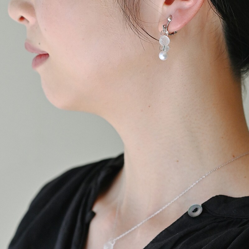 煌めきと透明感、艶やかさの3つの表情が重なり合い、印象的なフォルムを形作るイヤリング。ガラスとパールが織りなす幻想的な輝きをお楽しみいただけます。