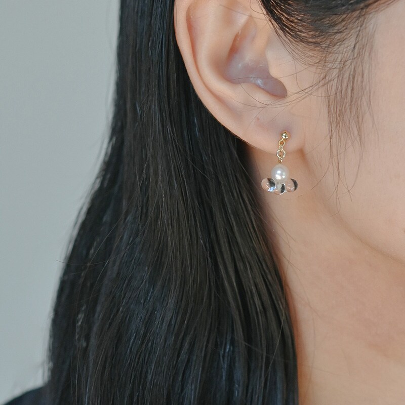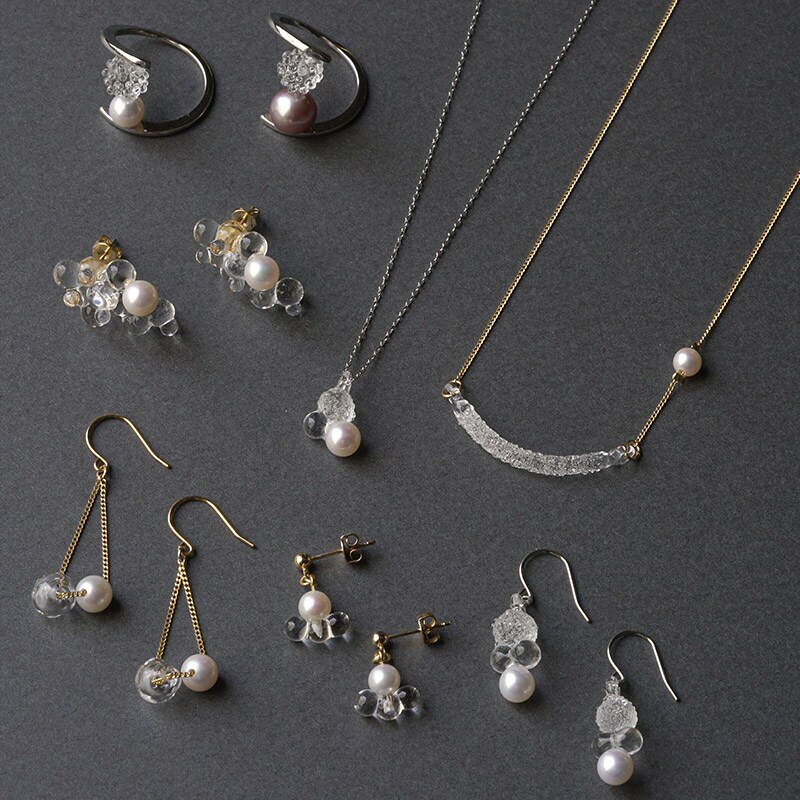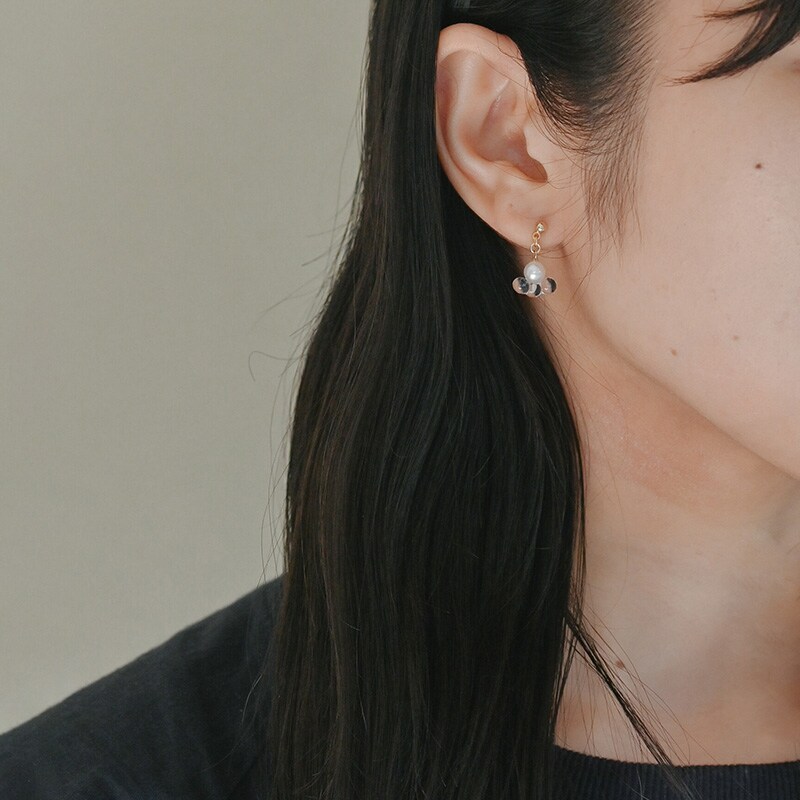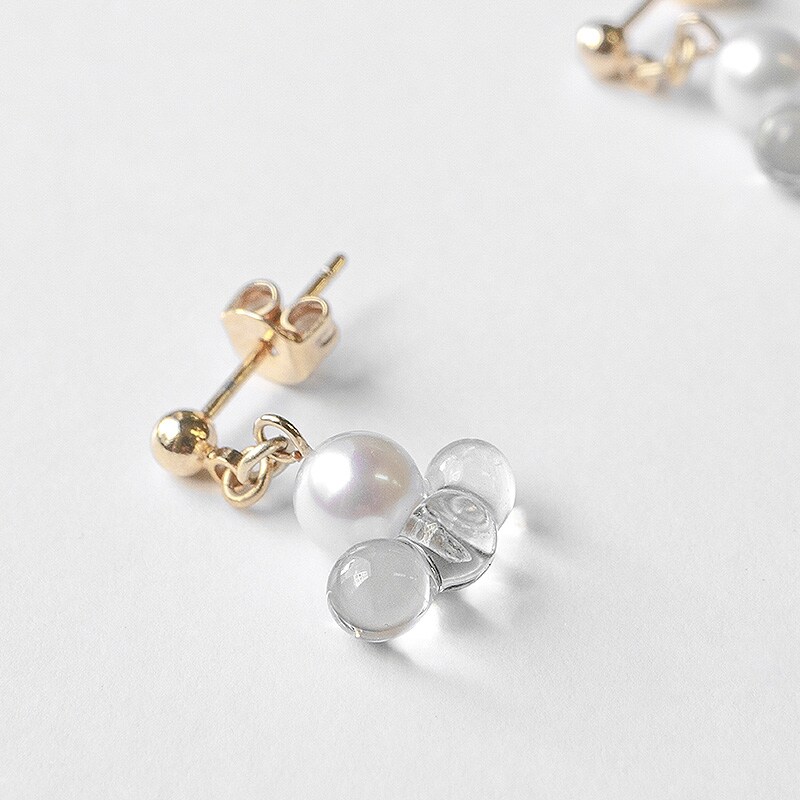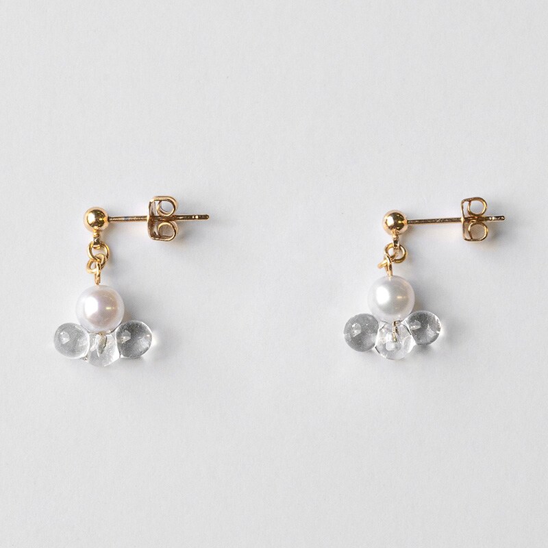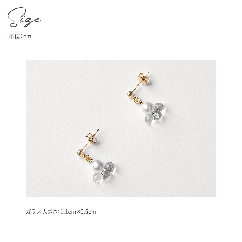 薄明りの夜空で星が静かに輝きはじめるような光景をイメージしたピアス。シンプルなパールに合わせて連なるガラスの光が、耳元で印象的に煌めきます。一粒パールとは一線を画す特徴的なデザインが魅力です。