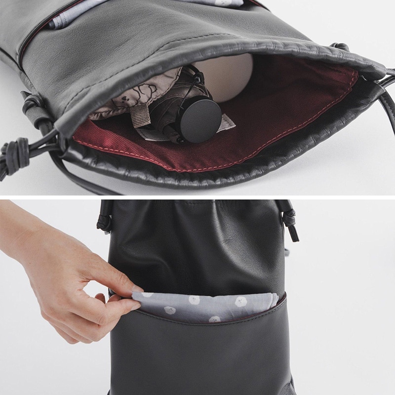 財布にスマートフォンなど、身の回りのちょっとしたものを入れるのにちょうどいいサイズ。小さめの水筒に折り畳み傘やポーチなども入り、見ため以上の収納力です。