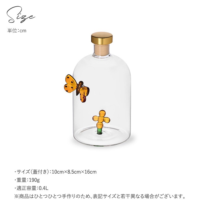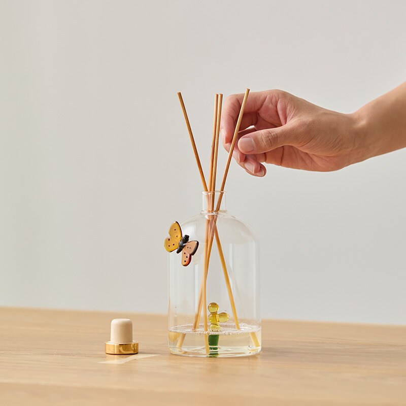 ボトルの内側底面と外側に立体的なデザインパーツがついており、まるで蝶がディフューザーに止まっているようなデザインです。細部にまでこだわりが詰まっているうえ、ひとつひとつ表情が異なるところも魅力です。
