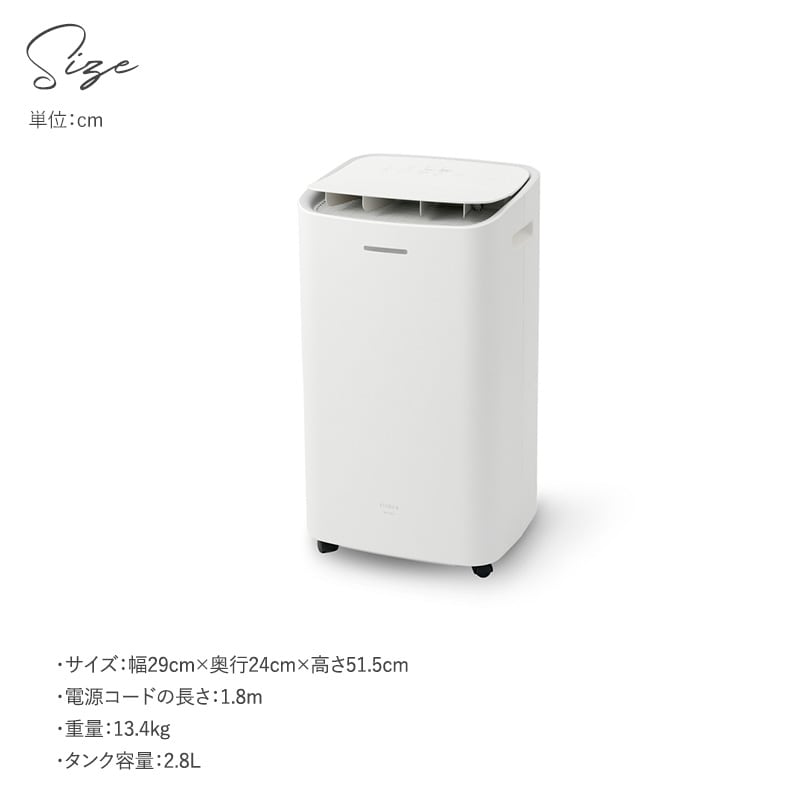 設置面積ほぼA4サイズのコンパクトさと、高い除湿能力を両立させた「コンプレッサー式 除湿機」。コンパクトなのにパワフルで衣類乾燥もおまかせ。幅わずか29cmの省スペース設計なので限られたスペースにも収納しやすく、使うときも使わないときも場所を取りません。