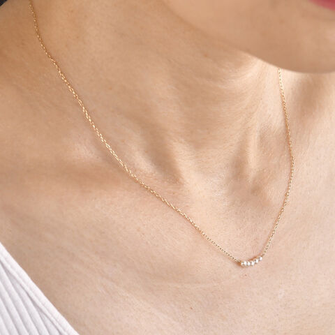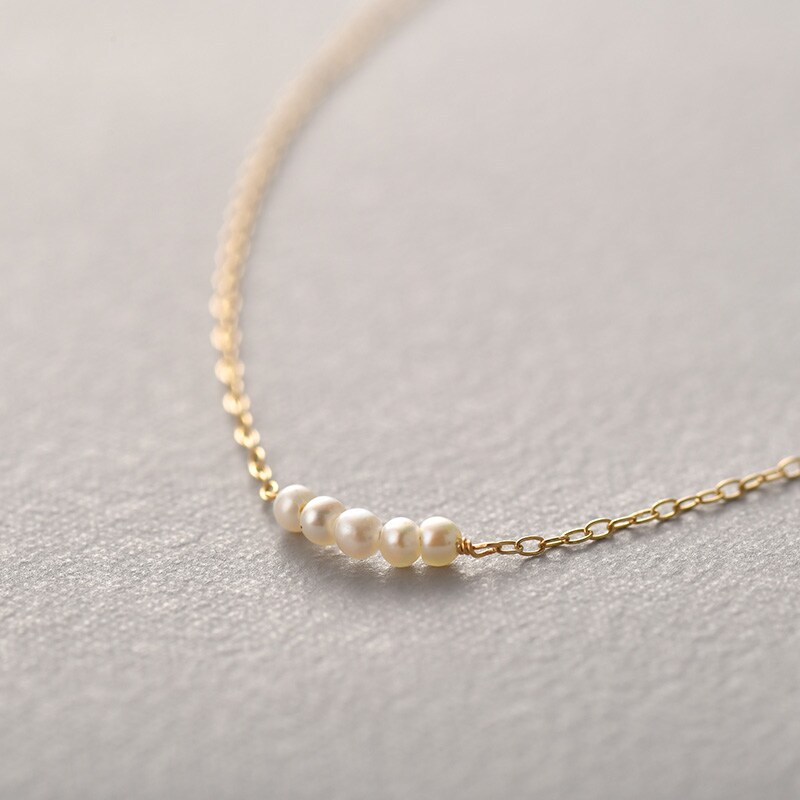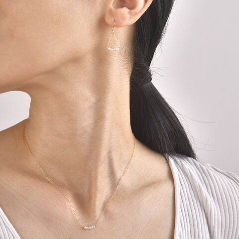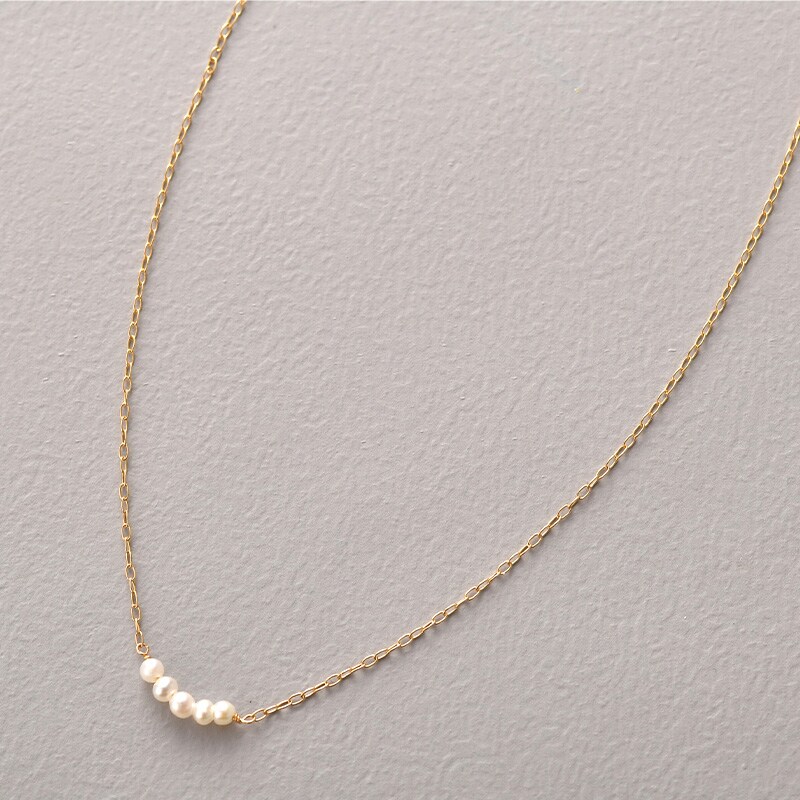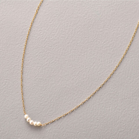 鎖骨に2mm程の小さな淡水パールを5粒と、細いチェーンがとても繊細なデザインのネックレス。淡水パールは光沢があり肌馴染みのいい色で、甘すぎない大人のかわいらしさを演出します。カジュアルコーデからシンプルコーデまで相性は抜群で、幅広く活躍します。