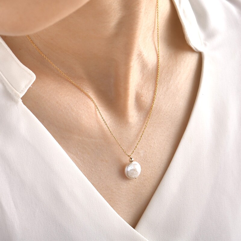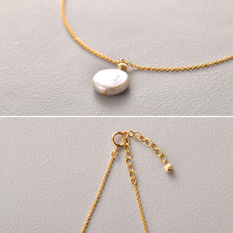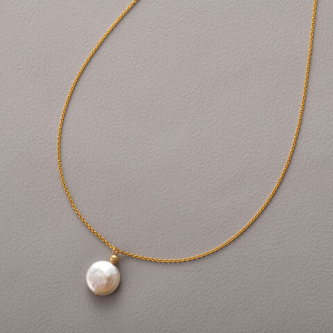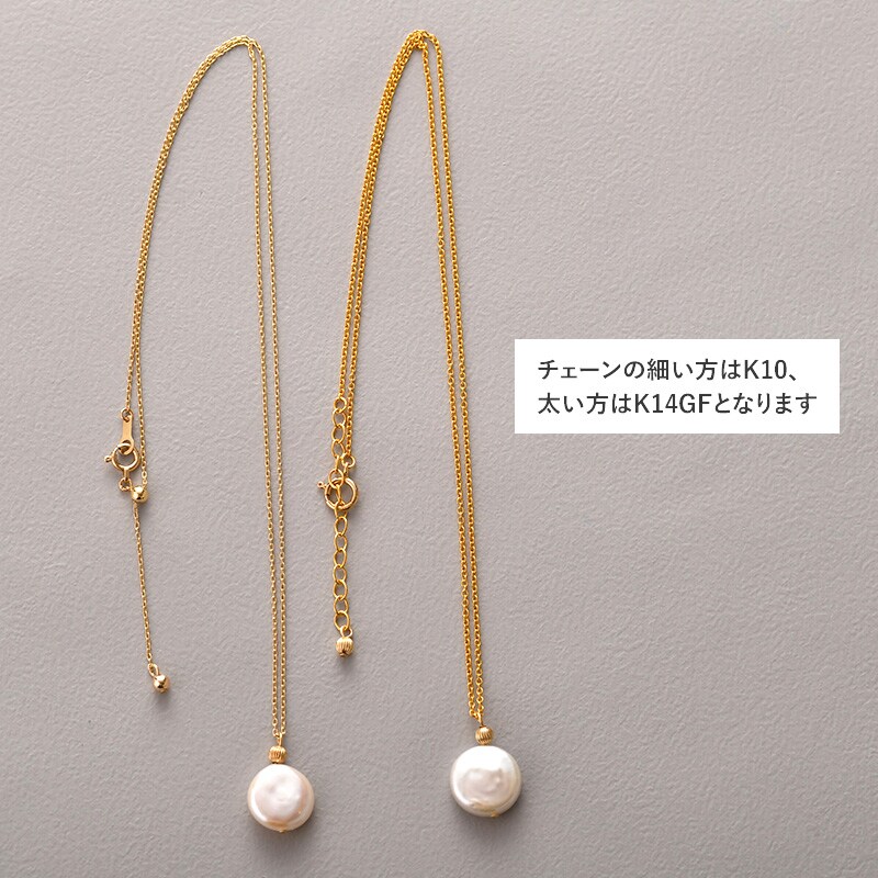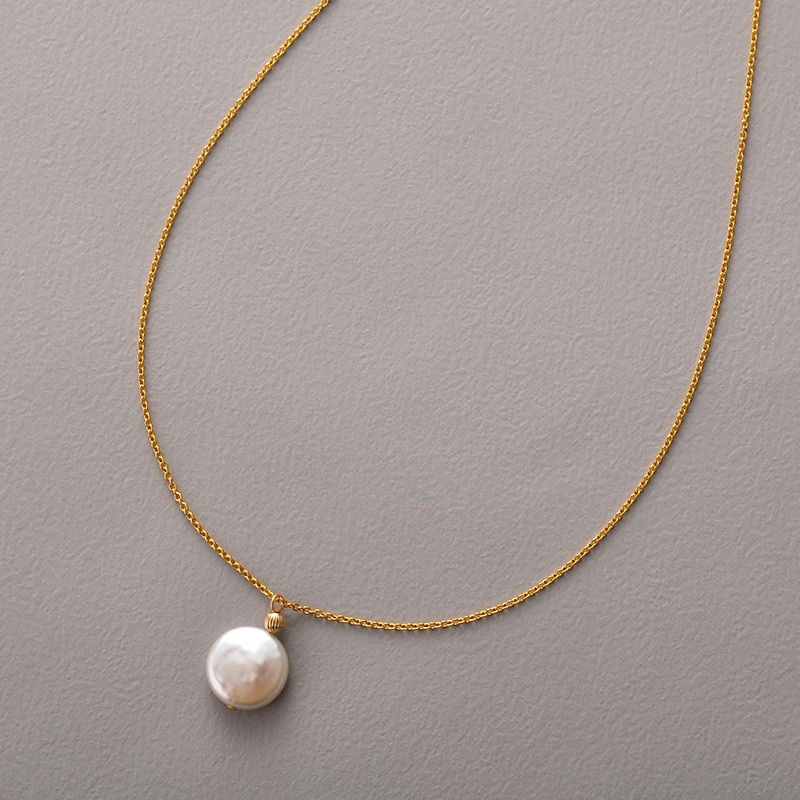 ペタンコまん丸のコイン型淡水パールのシンプルなシリーズ。白いカットソーや黒のニットなどとの相性抜群で、デイリー使いやフォーマルシーン、様々なシチュエーションでお使いいただけます。