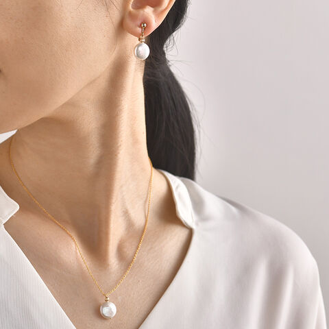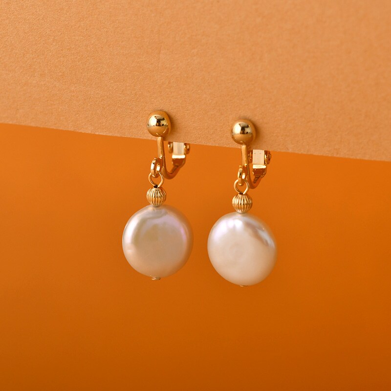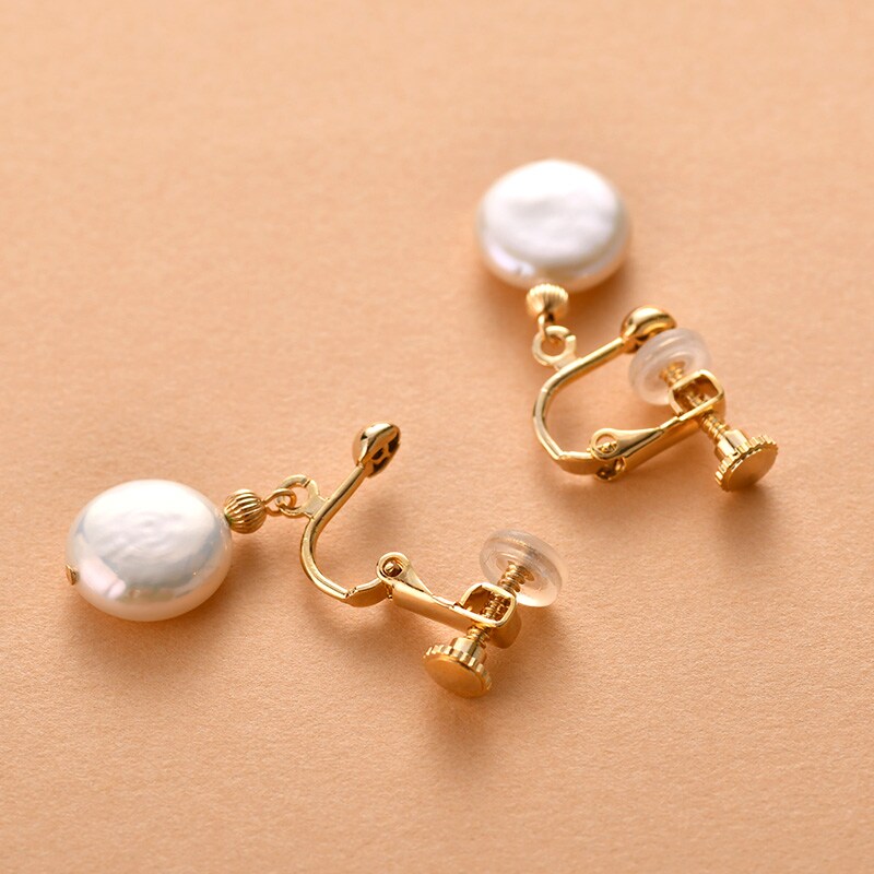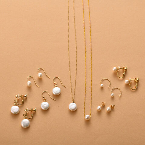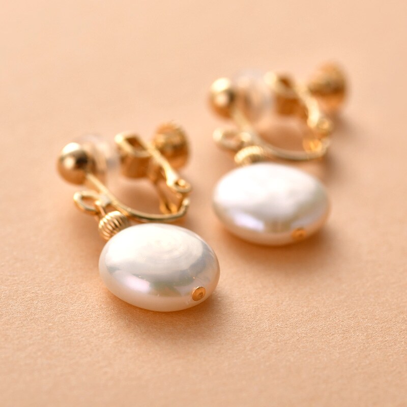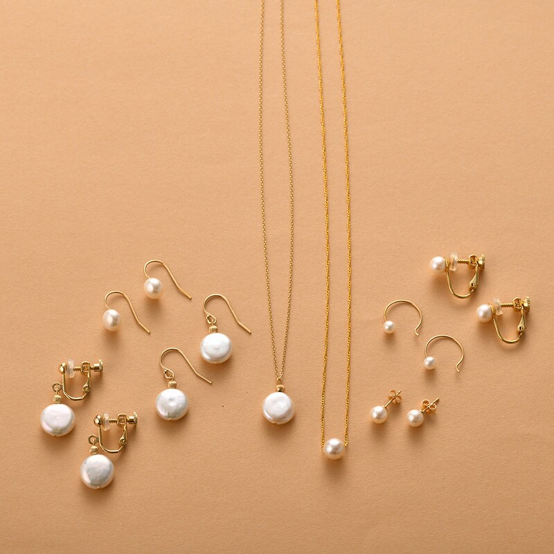 ペタンコまん丸のコイン型淡水パールのシンプルなシリーズ。白いカットソーや黒のニットなどとの相性抜群で、デイリー使いやフォーマルシーン、様々なシチュエーションでお使いいただけます。