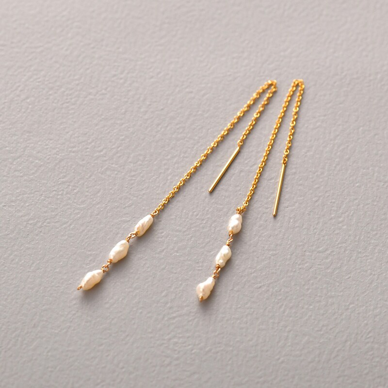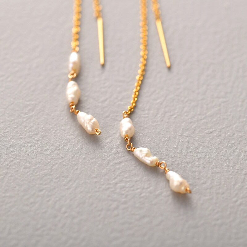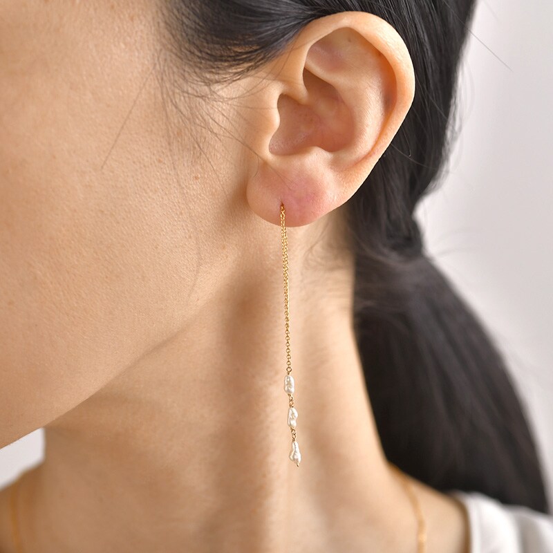 タテ型の凹凸があるバロックなケシパールを連ねたピアス。クシュっとした表面と光沢が特長で、ナチュラルな印象のパールです。チェーンから下がる3粒のパールが、繊細さと上品さを兼ね備えています。