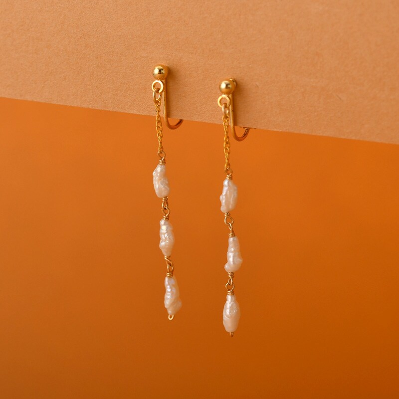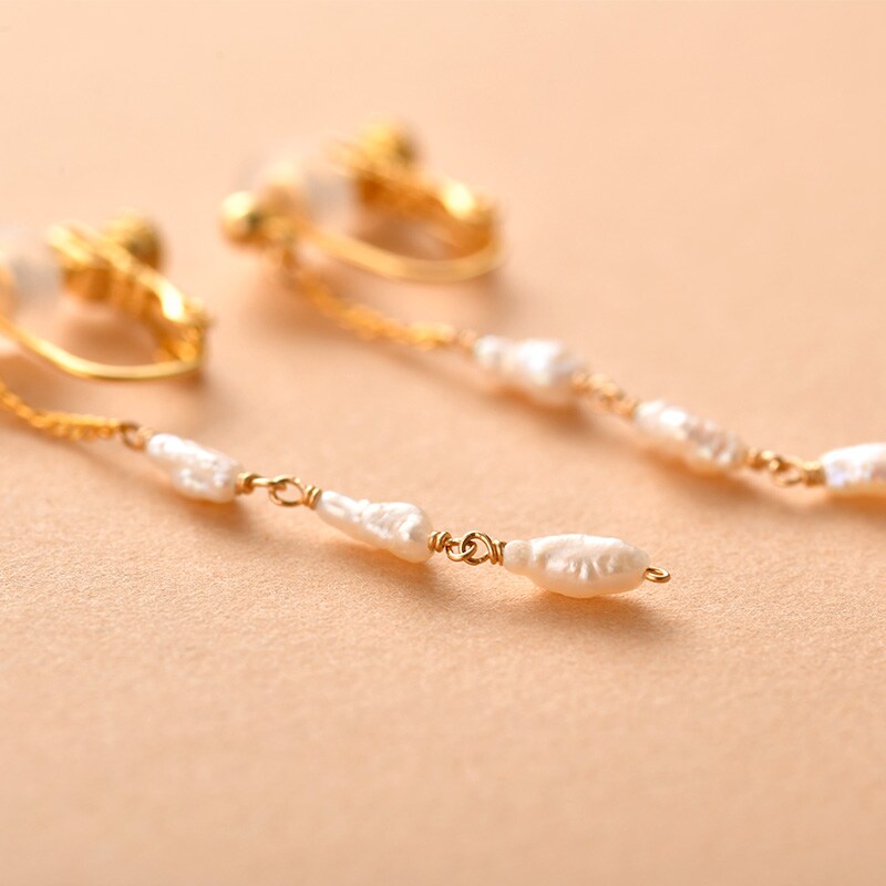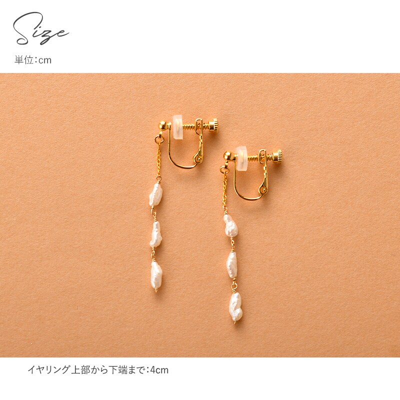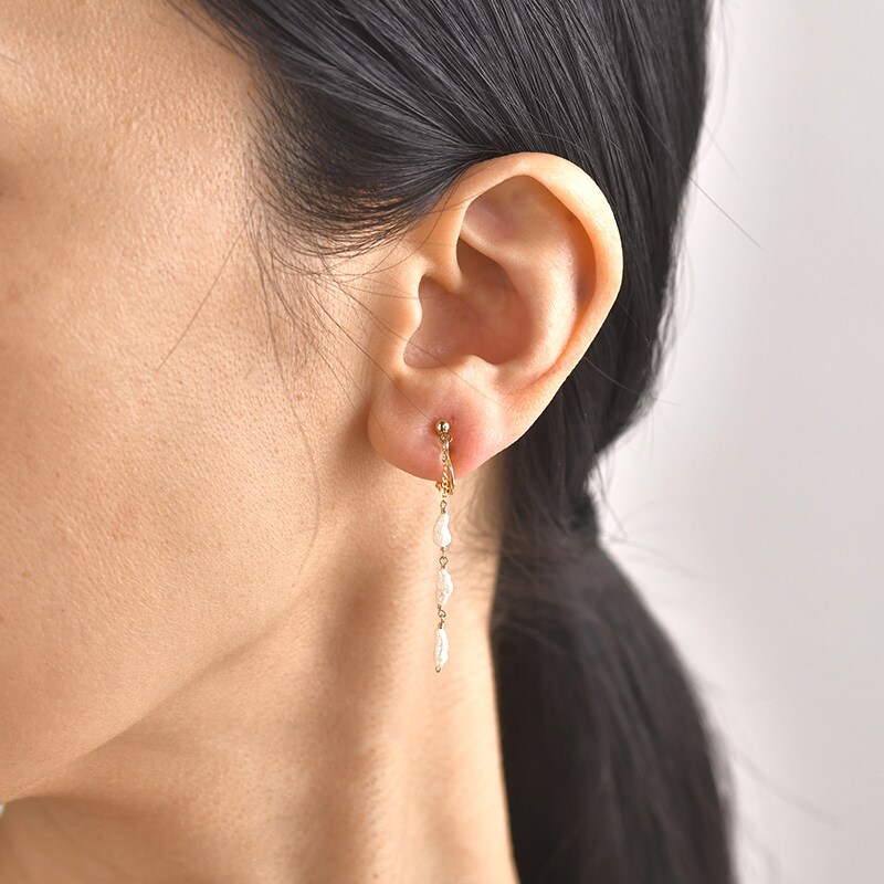 タテ型の凹凸があるバロックなケシパールを連ねたイヤリング。クシュっとした表面と光沢が特長で、ナチュラルな印象のパールです。チェーンから下がる3粒のパールが、お顔まわりを華やかにします。