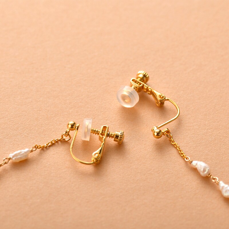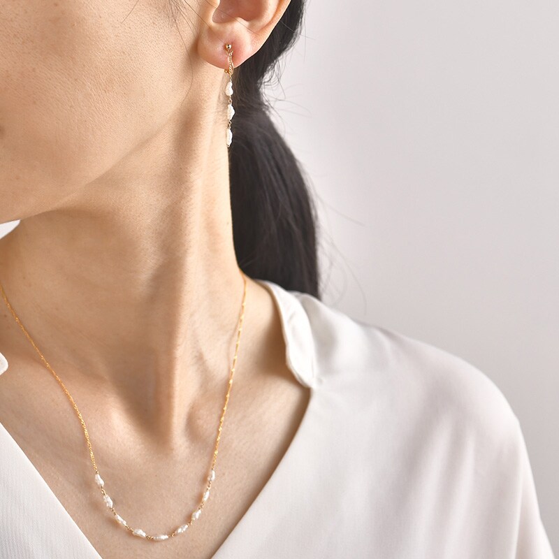 お揃いのネックレスと合わせれば、こなれ感を演出します。イヤリングの金具部分は合金メッキを、その他の金具には14KGFを使用しています。アレルギーや変色をおこしにくく、長くご愛用いただける素材です。