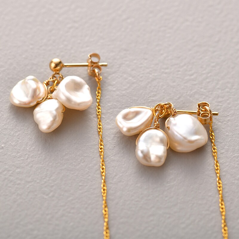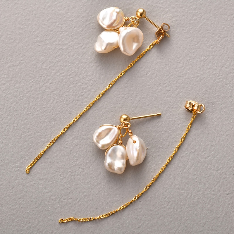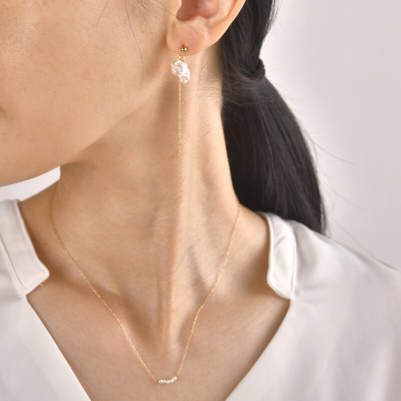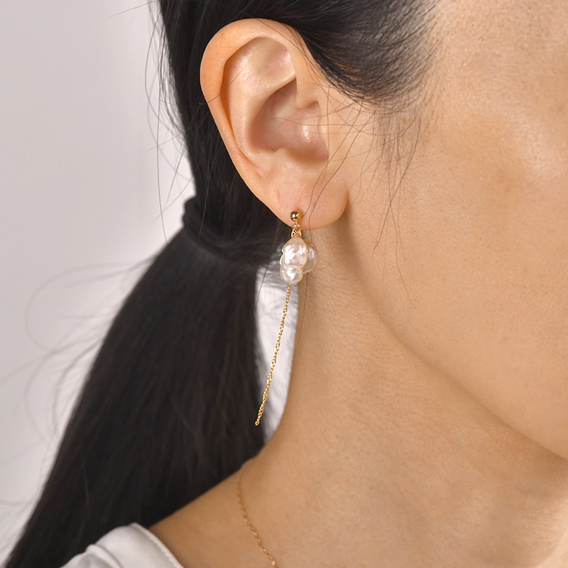 キャッチには繊細なチェーンがついていて動くたびに軽やかに揺れるので、パールのボリューム感とチェーンの繊細さの絶妙なバランスがお楽しみいただけます。