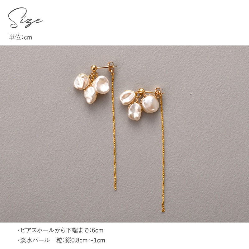 金具にはK14GFを使用しているので、お肌に優しく、長くご愛用いただけます。光沢のある淡水パールが印象的で日常使いにはもちろん、ちょっとしたお出かけから結婚式まで、マルチにお使いいただけます。