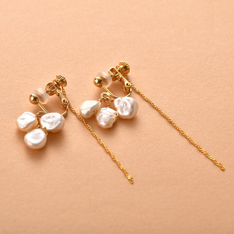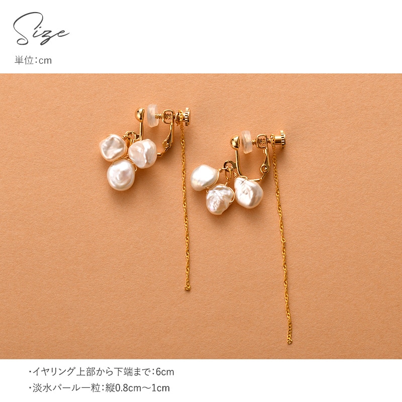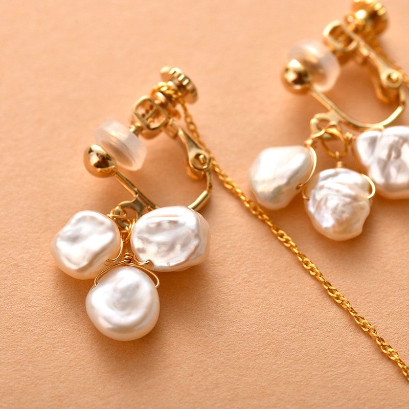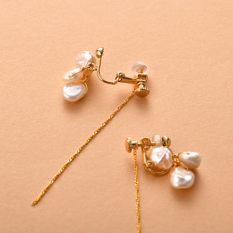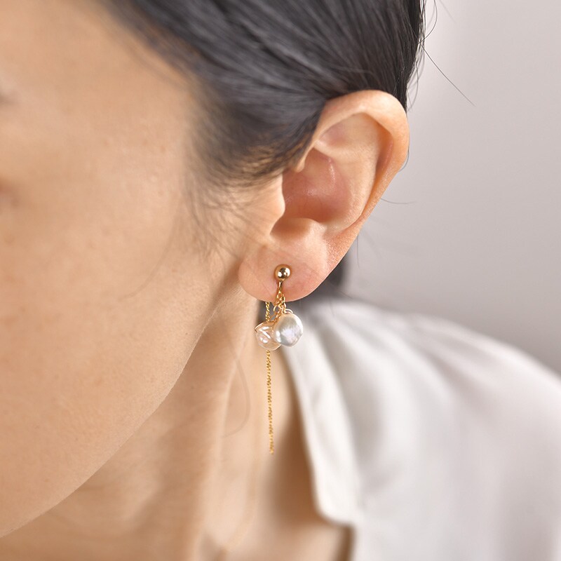 留め具には繊細なチェーンがついていて動くたびに軽やかに揺れるので、パールのボリューム感とチェーンの繊細さの絶妙なバランスがお楽しみいただけます。