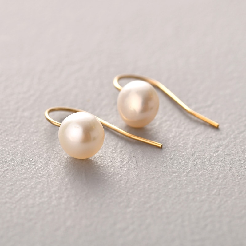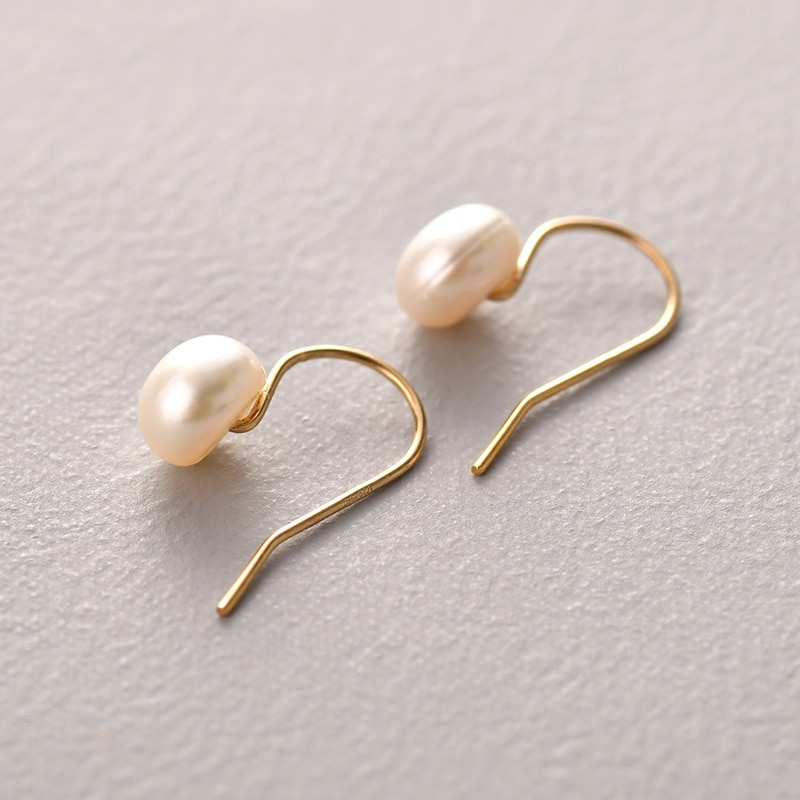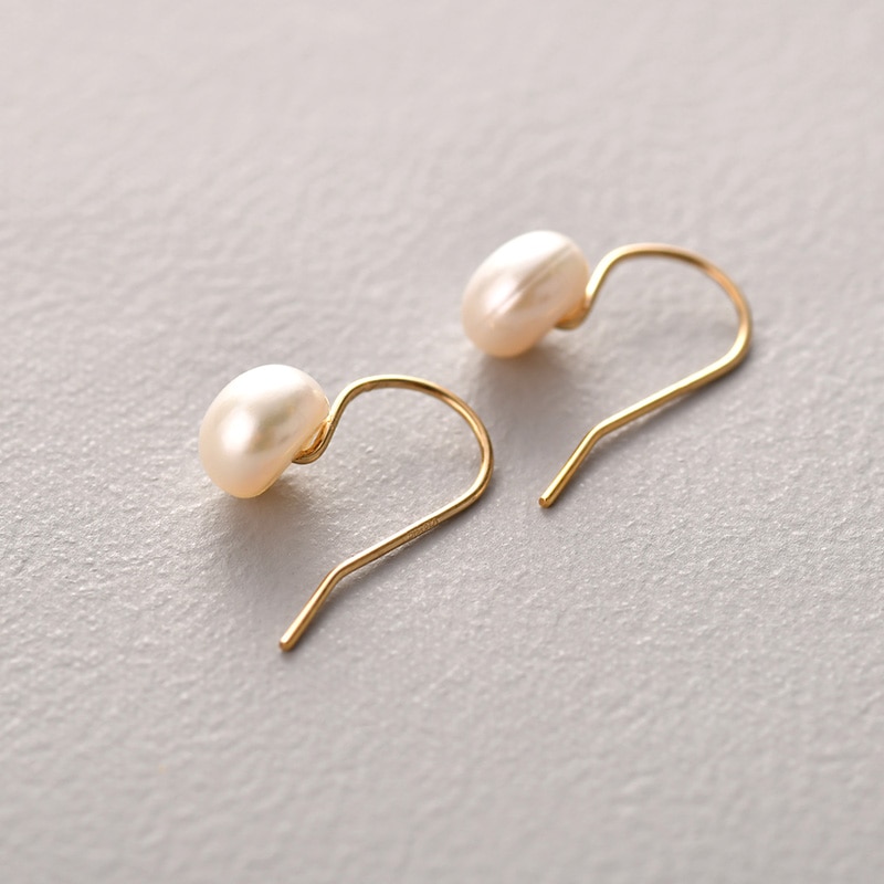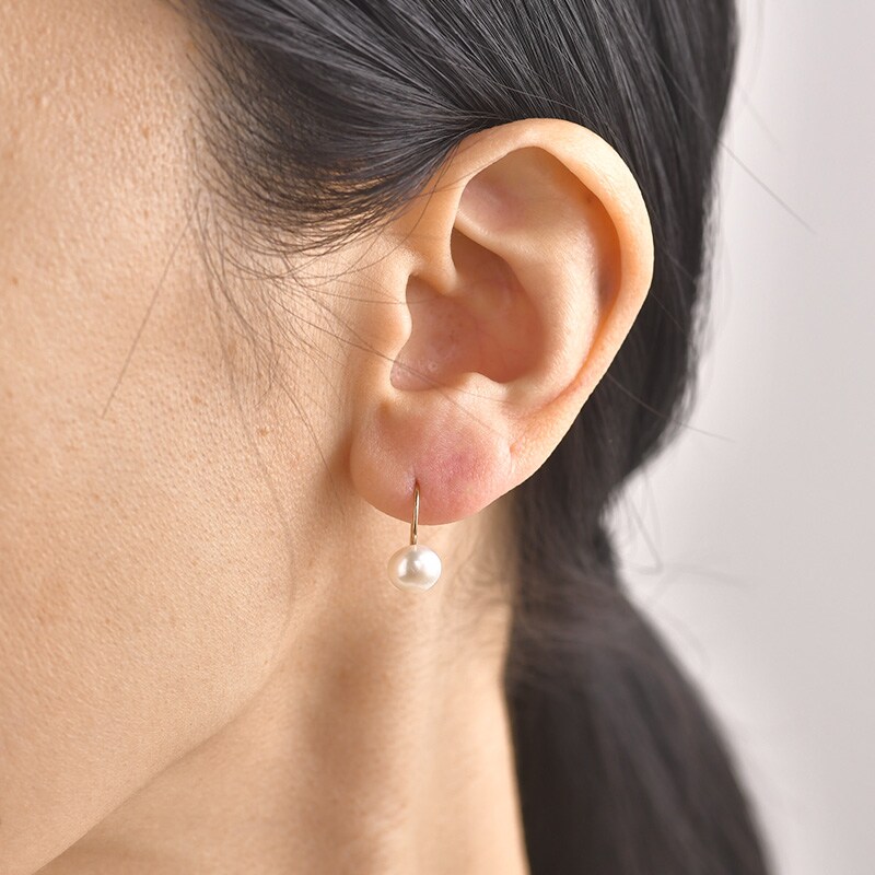 ボタン型の淡水パールがかわいい、耳にそうようにフィットするデザインのピアス。耳から垂れ下がるフックピアスの先端に淡水パールがトッピングされています。