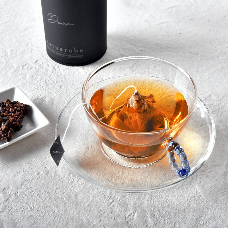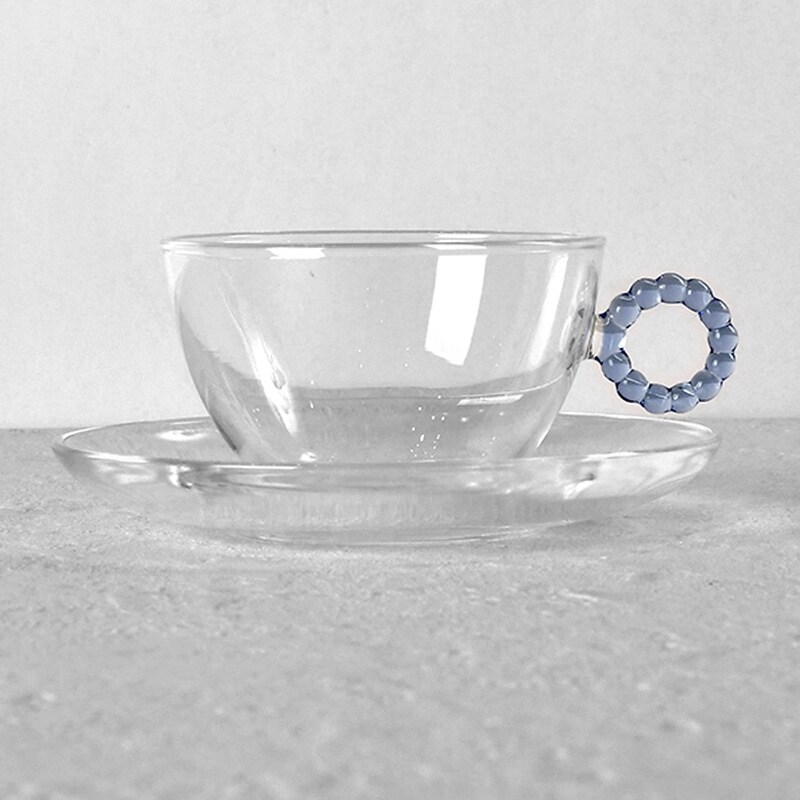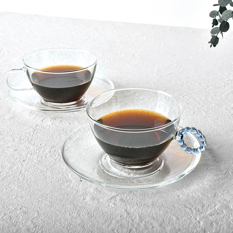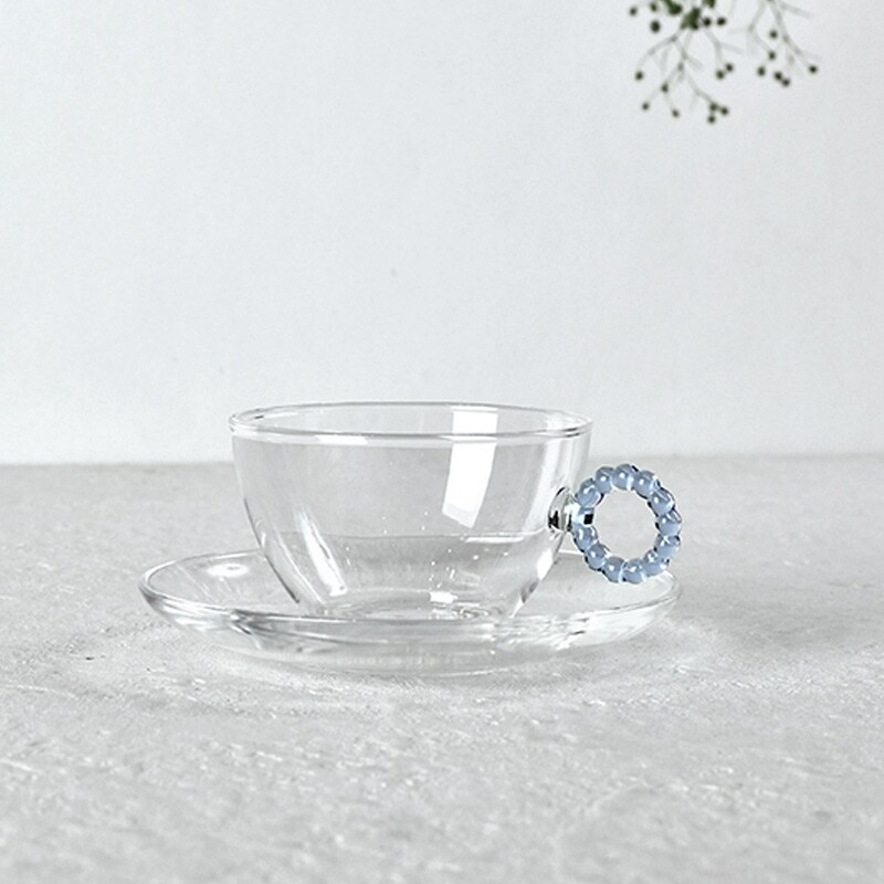 HARIO Lampwork Factory×natu&robeのコラボ商品、持ち手がブルーの別注カラーが新登場。丸みのあるやさしいフォルムのカップに、アクセサリーサークルのモチーフが持ち手になっている、まるでアクセサリーのような食器です。持ち手部分はガラス職人がひとつひとつ手づくりしており、それぞれの表情の違いがお楽しみいただけます。