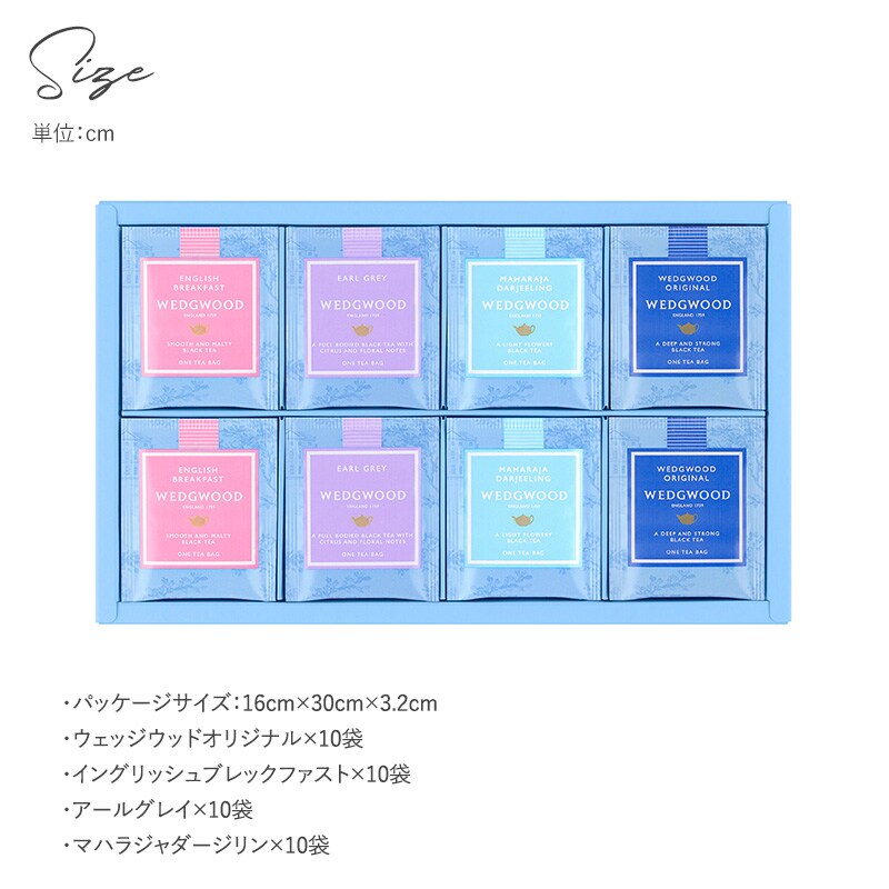 内容量:ウェッジウッド オリジナル ティーバッグ×10袋、イングリッシュ ブレックファスト ティーバッグ×10袋、アールグレイ×10袋、マハラジャ ダージリン×10袋