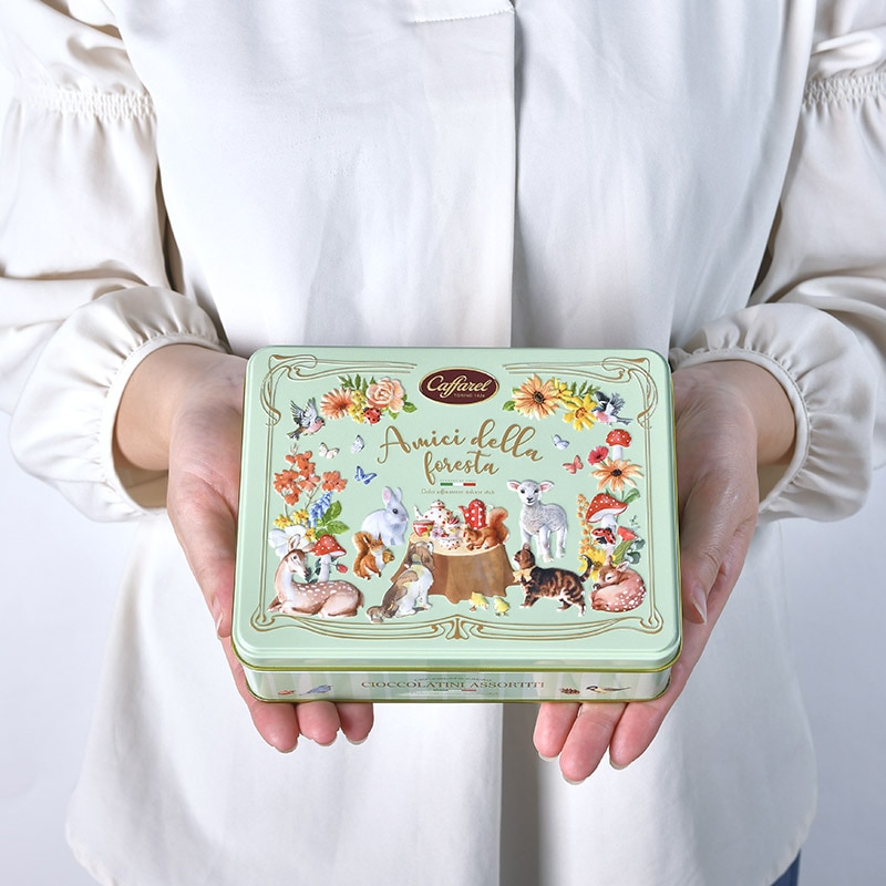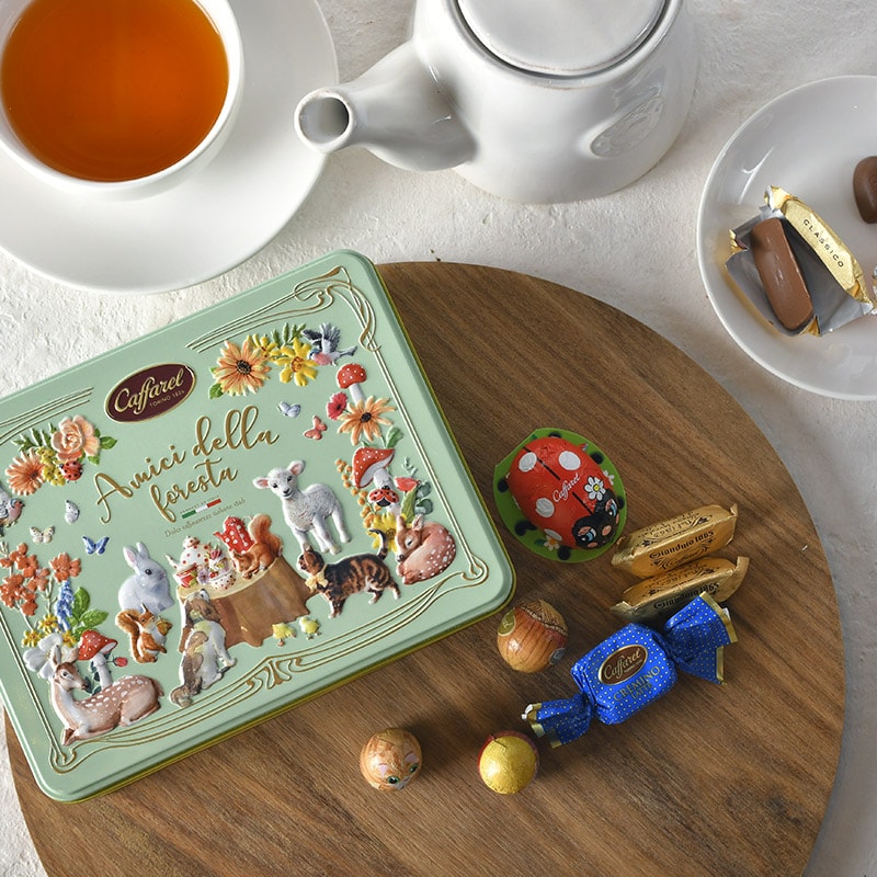 ストーリー性のある、こちらの16粒入りと、8粒入りの「アミーチ・デッラ・フォレスタ」のパッケージデザイン。特別感のあるデザインで、缶好きにはたまらないコレクションになりそう。シーンを選ばずご利用いただける宝石箱のようなアソート缶は、バレンタインや頑張った自分へのご褒美、しっかりお礼を伝えたい時のお返しなどにもおすすめです。小物入れとしてもお使いいただけるので、食べ終わったあとも楽しさが続きます。