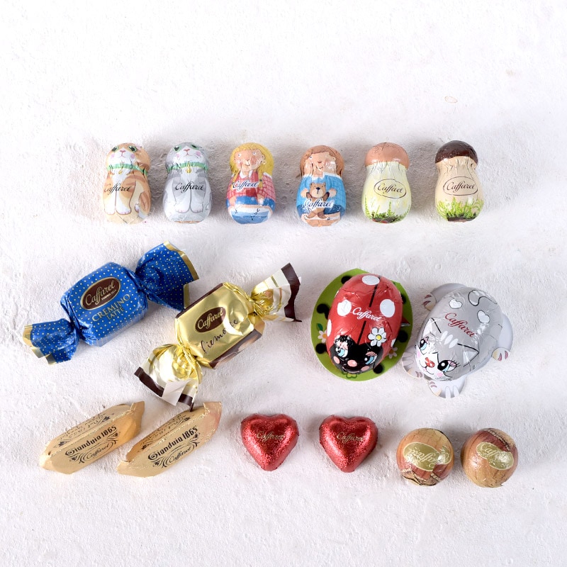 カファレルを代表するジャンドゥーヤをはじめ、かわいい表情のてんとう虫やネコ、大粒のヘーゼルナッツが入ったピエモンテなど、全16粒が贅沢にアソートされたコレクションです。