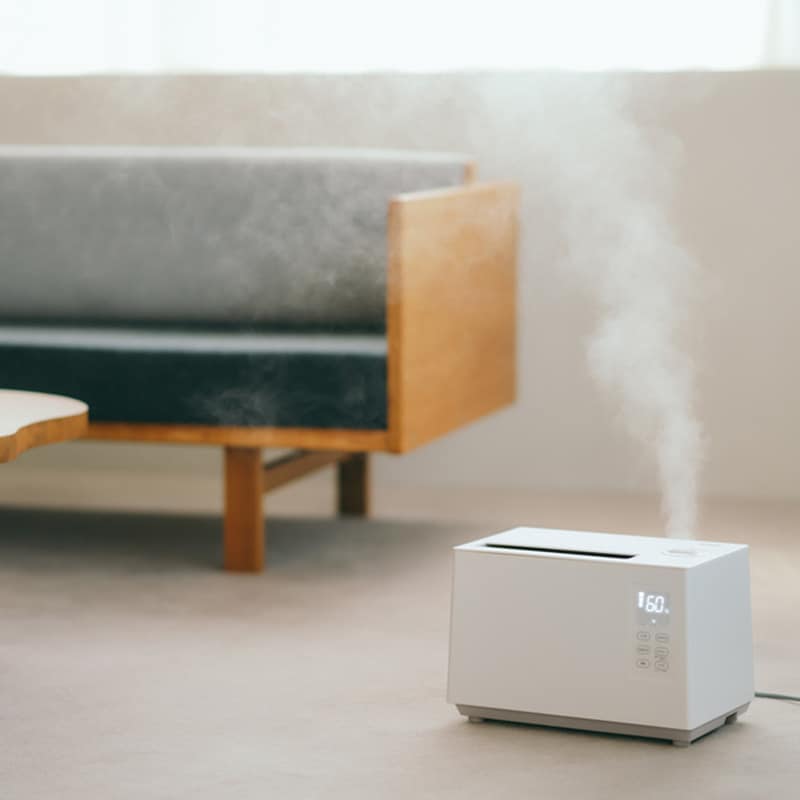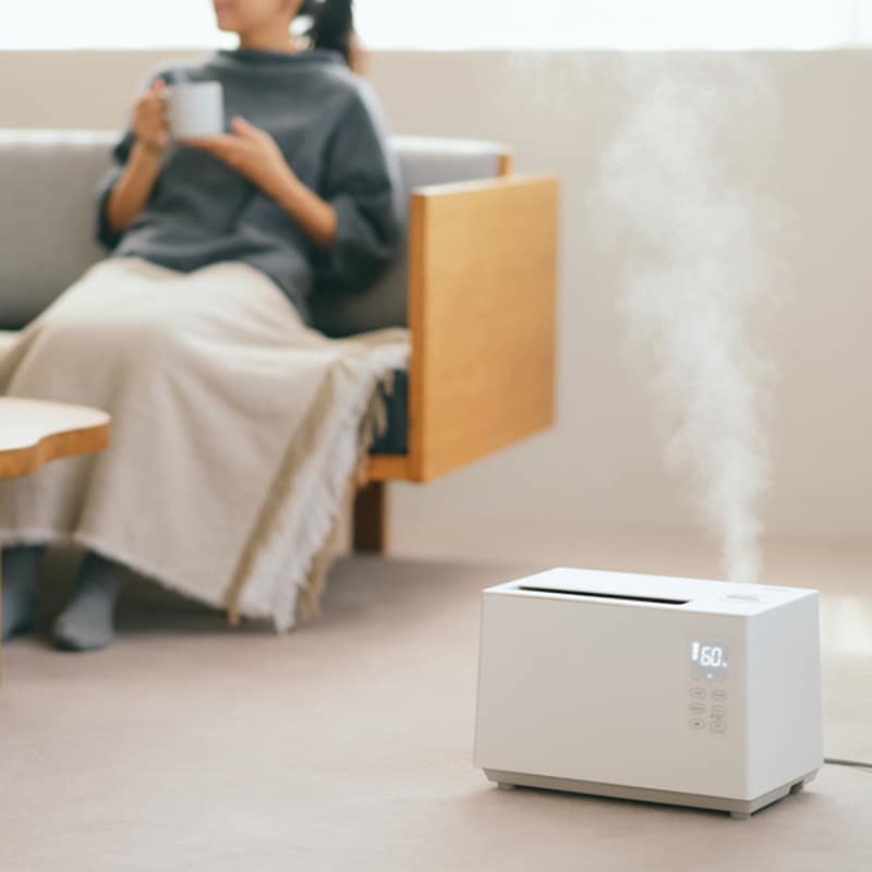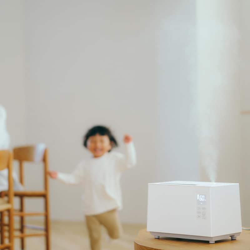 約75℃まで加熱した後、実際に吹き出し口から放出されるミストは50℃程度の「ぬくもりミスト」。火傷の心配もなく、小さなお子さまやペットのいるご家庭でも安心してお使いいただけます。