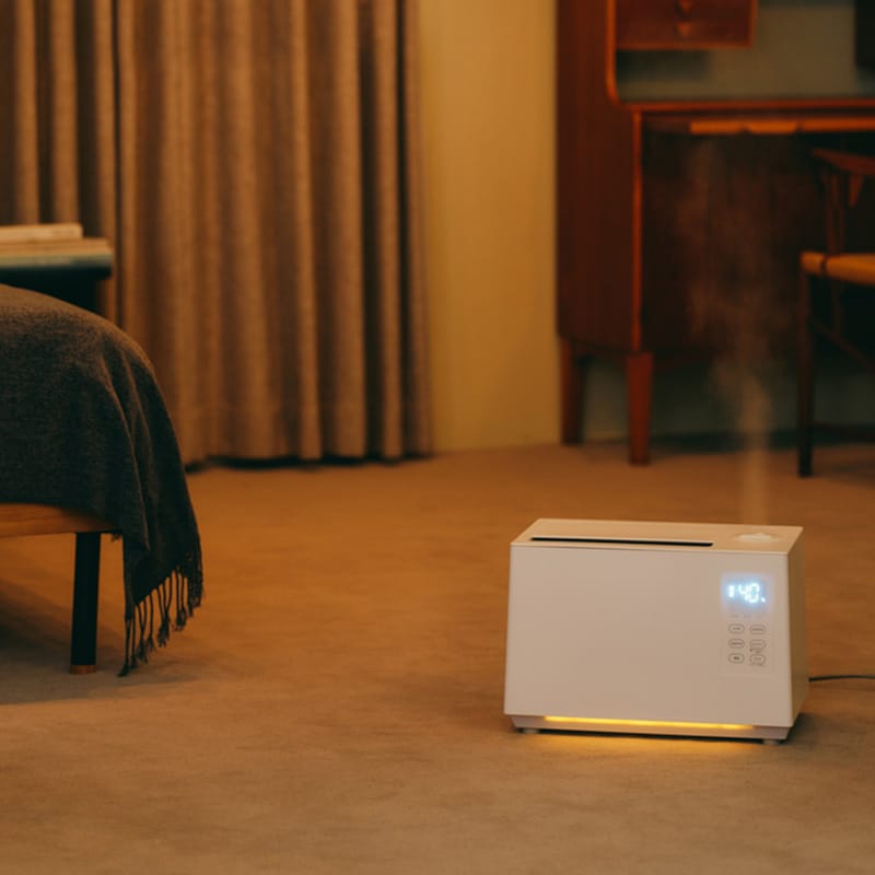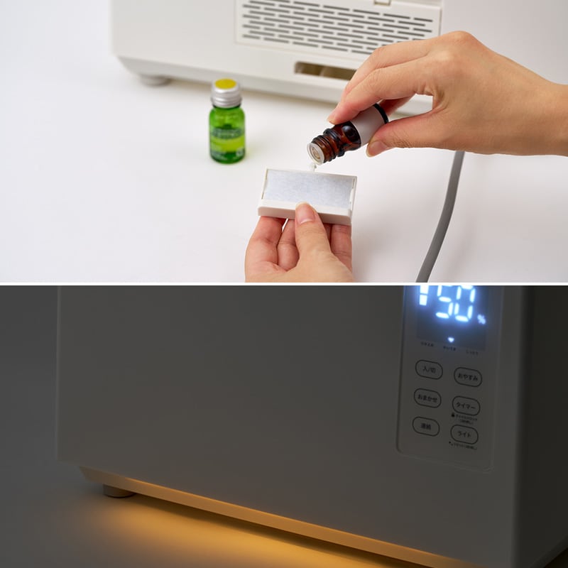 本体下部にはフットライトを搭載。寝室などの暗い部屋で使う際には、間接照明代わりとしても活躍します。さらに、アロマオイルも使用できるため、お気に入りの香りとともに寝室を潤すことができます。