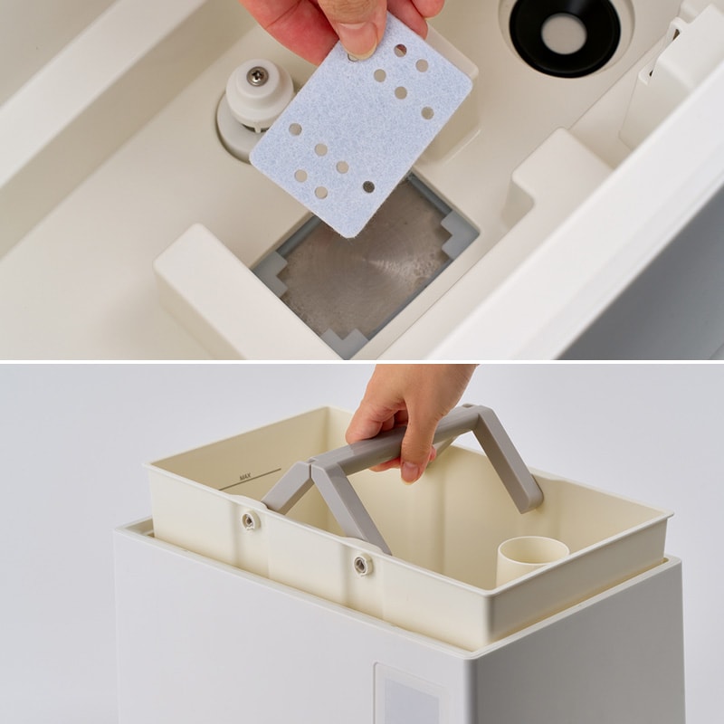水タンクやヒーターカバー、銀イオンユニットは水洗いが可能なので、いつでも衛生的に使えます。銀イオンユニットや、ヒーターへのスケール(水道水中のミネラル成分が固まったもの)付着を防ぐ、使い捨てタイプのスケール吸着パッドは交換可能です。