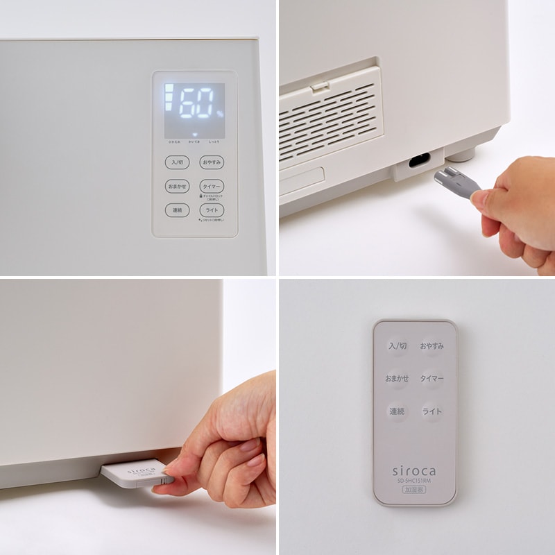 本体底面のスペースに収納可能な、離れた場所からも操作のできる便利なリモコン付き。電源コードは取り外しができるので収納の際に便利です。また、タンク内の水の量を知らせる水位表示つき。水がなくなると、給水アイコンとブザーでお知らせします。
