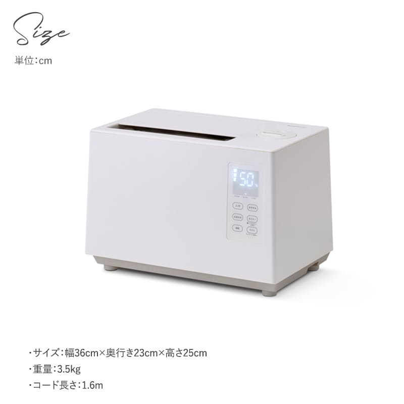 加湿量は最大500ml/h。最大14畳まで対応可能なので、いろいろな場所で活躍します。5Lも入る大容量の水タンクで、最大加湿で10時間給水が不要。3段階で設定可能な「おまかせモード」、2段階で設定可能な「連続モード」、寝室に最適な「おやすみモード」搭載で、生活にあわせてご使用いただけるハイブリット加湿器です。