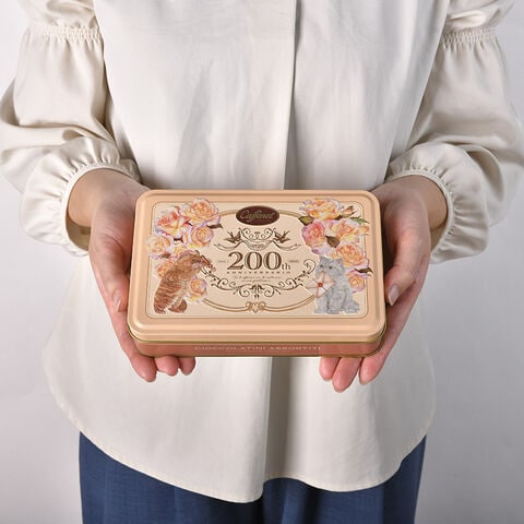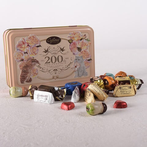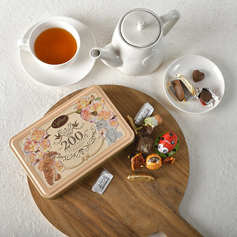 カファレルイラストの猫達が手紙の準備をしているシーンが華やかな缶。贈った方の笑顔が目に浮かぶようなかわいさです。バレンタインのギフトにはもちろん、シーンを選ばずご利用いただけます。