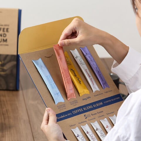 世界各国のコーヒーが楽しめるギフトセット。ページをめくるようにスティックを選び、その日の気分にぴったりの一杯をご堪能いただけます。コーヒー豆の豊かな個性を心ゆくまでお楽しみください。