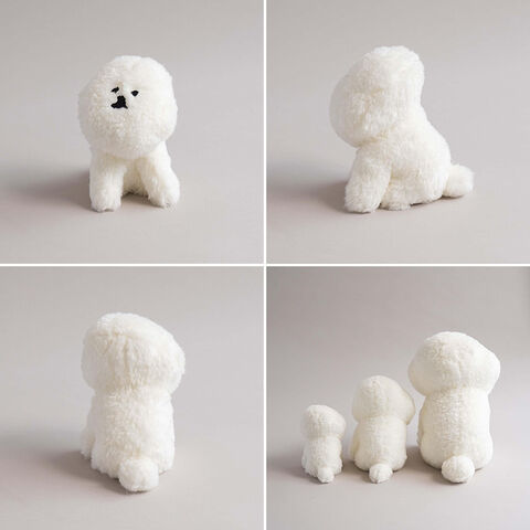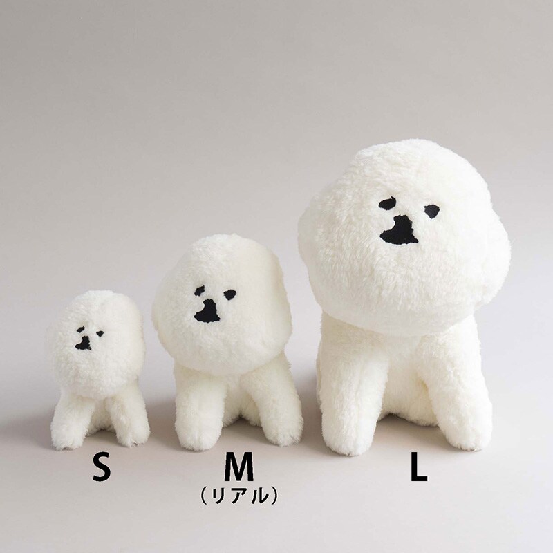 イラストレーター 塩川いづみさんが描いた「ビション・フリーゼ」がモチーフの、なんとも愛らしい子犬のぬいぐるみです。もこもことした純白の巻き毛からのぞく、つぶらな瞳や鼻がたまりません。従来のお座りポーズMAMBOに比べ、こちらは小さめでかわいいSサイズ。