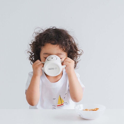 安定感のある口が狭まった山型のかたちで、両手で持てるので、小さなお子さまでも扱いやすいマグカップです。