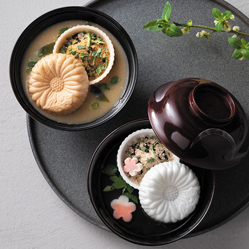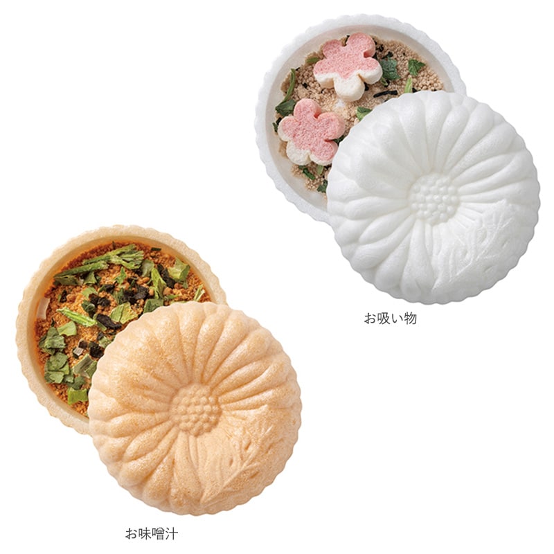 高貴で気品のある菊紋の最中に包まれた、お吸い物とお味噌汁のセット。お椀に最中を丸ごと入れて、熱湯を注ぐだけ。手軽で見栄えも良く、お子さまからご年配の方まで、気軽にお楽しみいただけます。