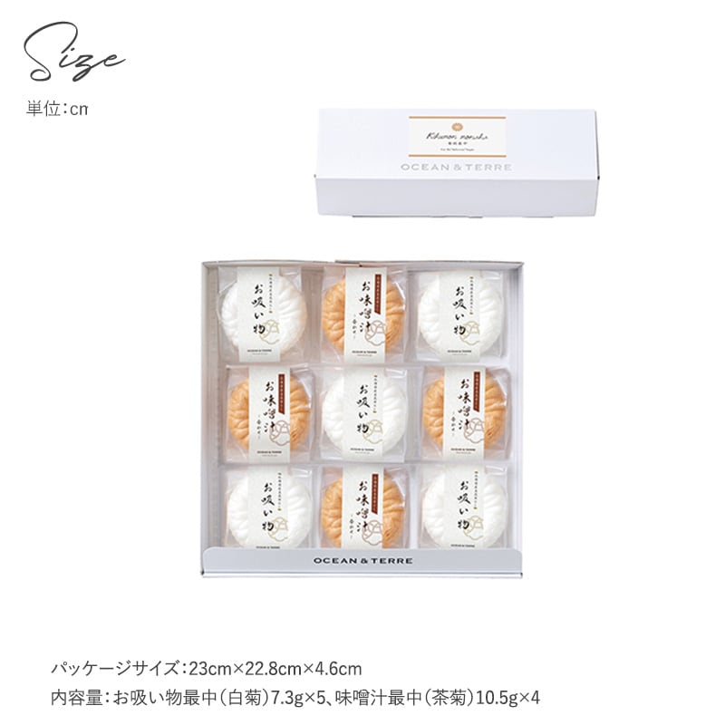 内容量:お吸い物最中(白菊)7.3g×5、味噌汁最中(茶菊)10.5g×4