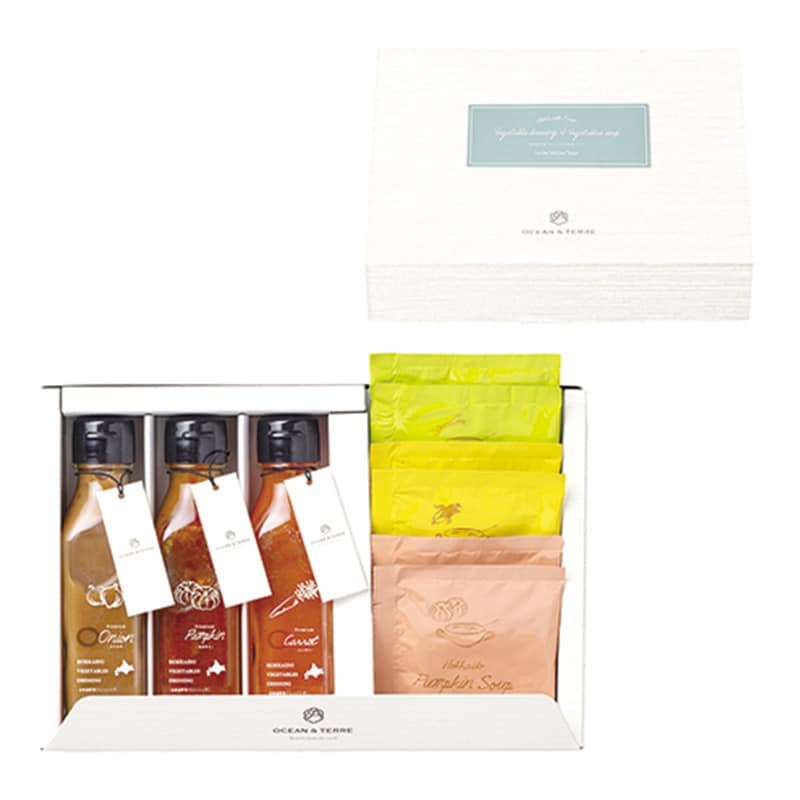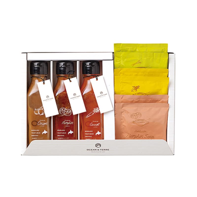 北海道のおいしい野菜で作られた、風味豊かな本格派ドレッシングとスープの詰め合わせ。大地の恵みを受けた自然の産物。野菜を使用した贈り物は、大切な方の健康を美味しく気遣います。