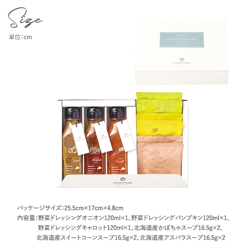 内容量:野菜ドレッシングオニオン120ml×1、野菜ドレッシングパンプキン120ml×1、野菜ドレッシングキャロット120ml×1、北海道産かぼちゃスープ16.5g×2、北海道産スイートコーンスープ16.5g×2、北海道産アスパラスープ16.5g×2