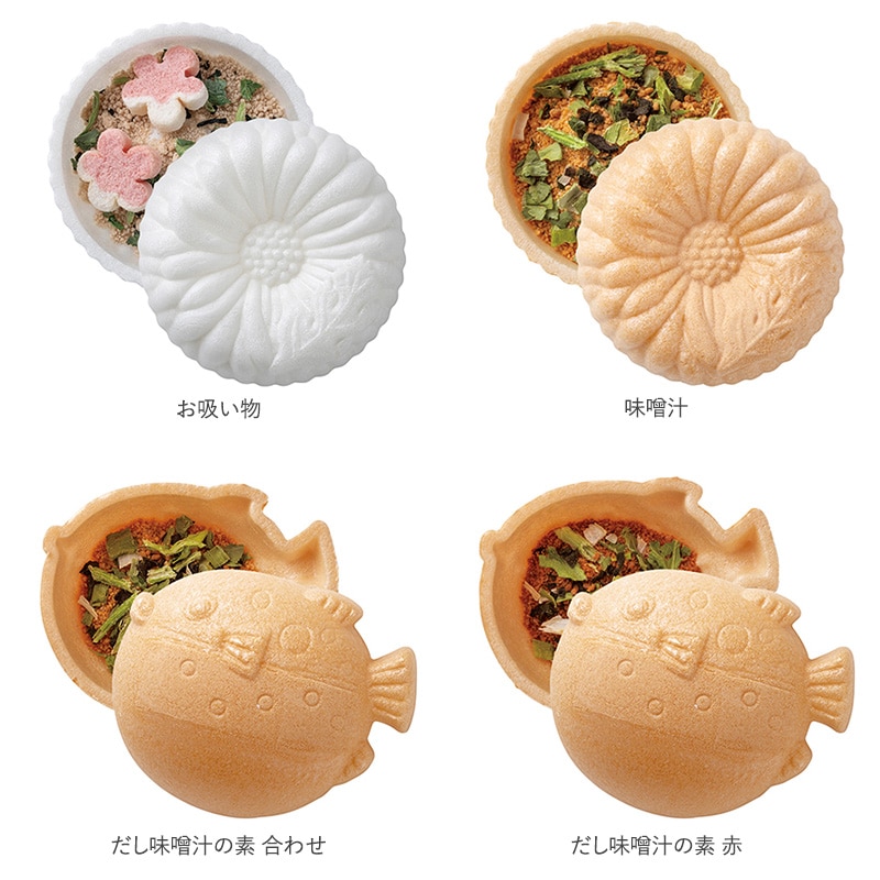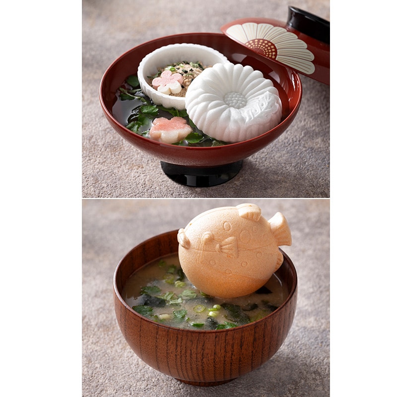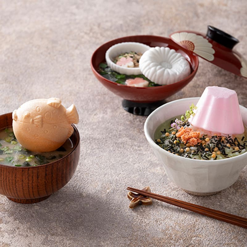 美しく縁起のいい富士山の最中に包まれたお茶漬けと、高貴で気品のある菊紋の最中に包まれたお吸い物とお味噌汁、かわいいフグ型の最中に包まれたお味噌汁の詰め合わせ。手軽で見栄えも楽しく、お子さまからご年配の方まで気軽にお召し上がりいただけます。