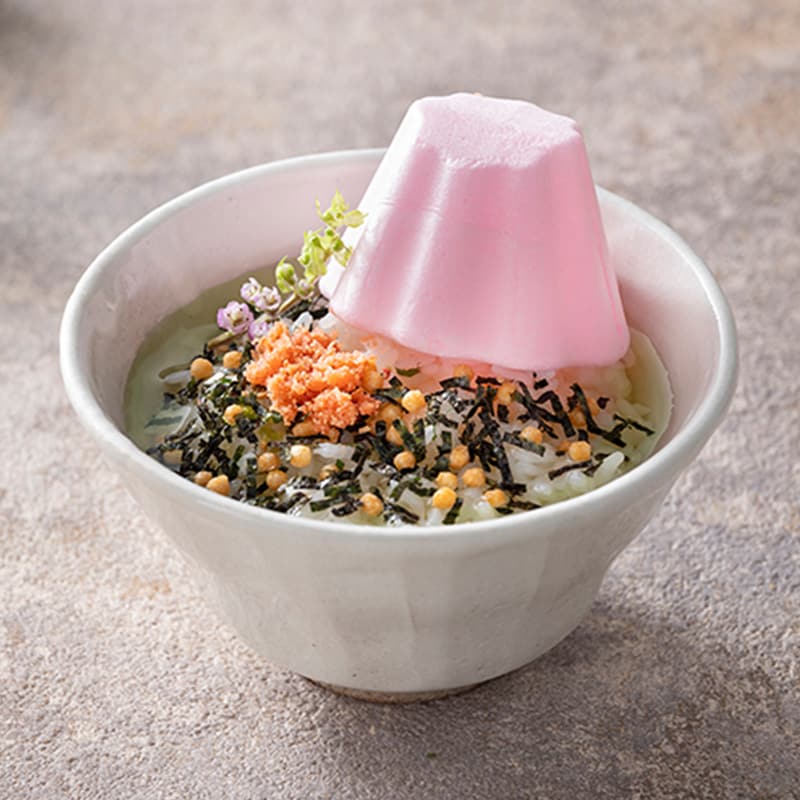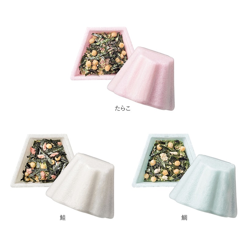 日本の象徴であり、縁起物の中でも人気の高い富士山の最中でお茶漬けの素を包みました。味は「たらこ、鮭、鯛」の3種類。ご飯の上に乗せて熱湯を注ぐだけで、最中が溶けてお茶漬けの出来上がり。