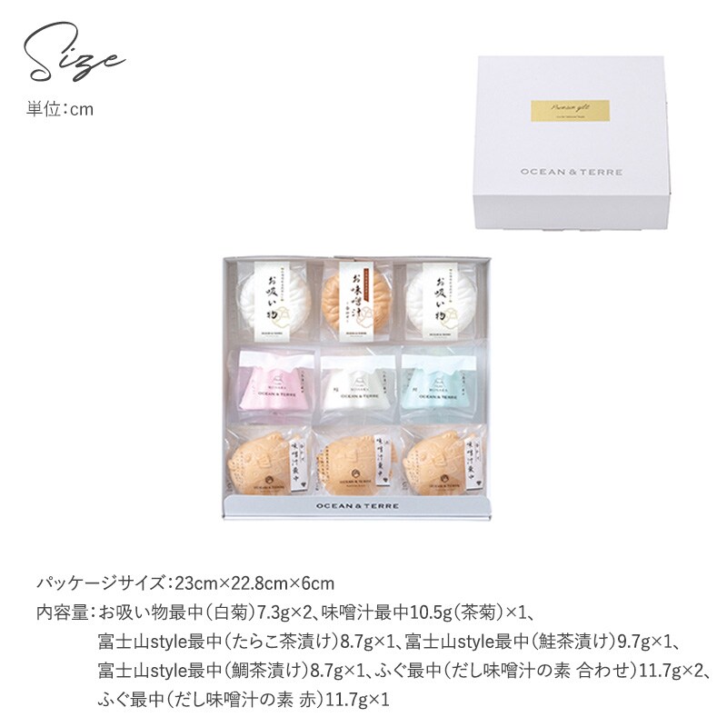内容量:お吸い物最中(白菊)7.3g×2、味噌汁最中10.5g(茶菊)×1、富士山style最中(たらこ茶漬け)8.7g×1、富士山style最中(鮭茶漬け)9.7g×1、富士山style最中(鯛茶漬け)8.7g×1、ふぐ最中(だし味噌汁の素 合わせ)11.7g×2、ふぐ最中(だし味噌汁の素 赤)11.7g×1