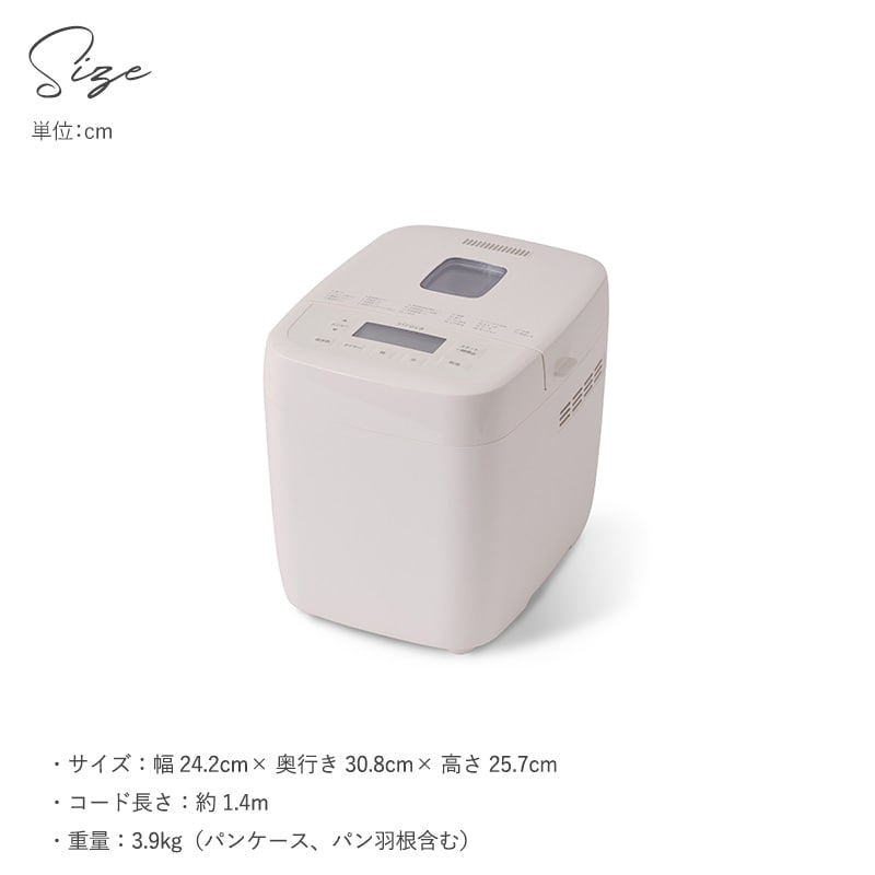 ・付属品:計量カップ、計量スプーン、パンケース、パン羽根、羽根取り棒、ヨーグルト専用容器、レシピブック