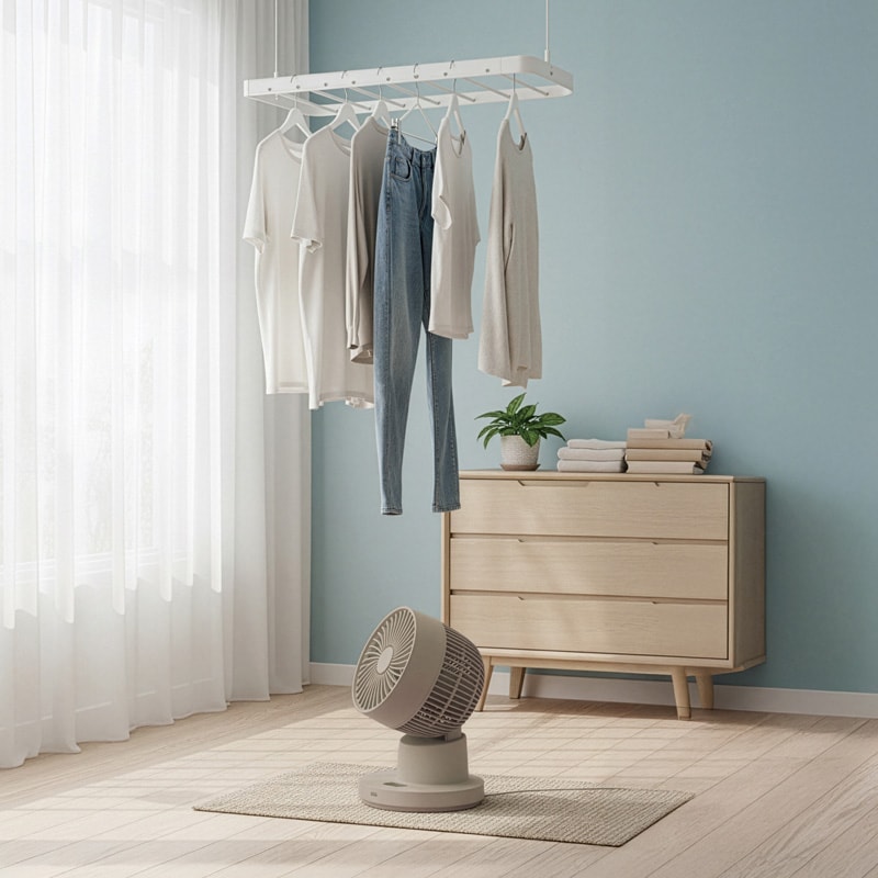 通常の2.3倍の速度で左右首振りをする「衣類乾燥モード」。衣類に当たる風の量を増やし、素早く湿気を飛ばします。雨の多い梅雨の季節には重宝します。