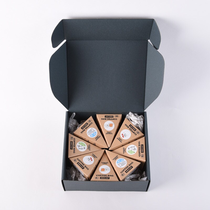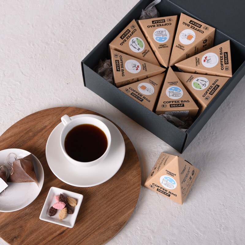 デカフェのコーヒーバッグテトラ8個セットを洗練されたギフトボックスに入れてお届けします。いろんな種類のコーヒーバッグの詰め合わせは、見た目もかわいく、様々な味がお楽しみいただけます。