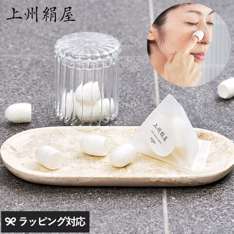 角質化した肌や余分な脂分を取り除き、なめらかな肌に整えてくれる「マユダマ」。お湯に浸し少し柔らかくしてから、ざらつきが気になる部分を優しく撫でるように使用します。絹ならではの肌なじみの良さを、洗顔後の清潔な肌でお楽しみください。
