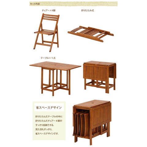 備考:耐久性のある天然木のアカシア材で作られた、ファミリー向けのテーブルセット。テーブルのほか、チェアーも4点セットです。オイルステイン加工を施してあるので水にも丈夫です。天然木の美しさと木のぬくもりを味わえ、座り心地も快適です。テーブル付きで、パラソルを差し込める穴も開いてます。(パラソルベースは別売です)チェアーは勿論のこと、テーブルもコンパクトに折りたため、さらにチェアー折りたたんだテーブルの中に収納しておけるので大変便利です。テラスやお庭など憩いのスペースでお使いください。