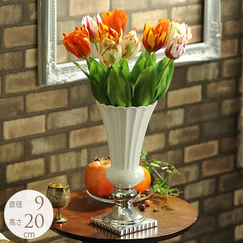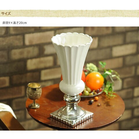 備考:ホワイトとシルバーの組み合わせが清潔感と清楚さを引き出すエレガントな花器。お部屋は勿論のこと、パーティ会場のテーブルやホテルのエントランスなどでもお使いいただける高級感溢れる一品です。