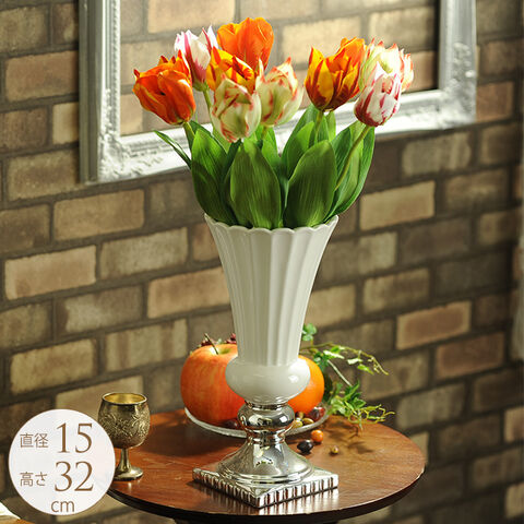 備考:ホワイトとシルバーの組み合わせが清潔感と清楚さを引き出すエレガントな花器。お部屋は勿論のこと、パーティ会場のテーブルやホテルのエントランスなどでもお使いいただける高級感溢れる一品です。