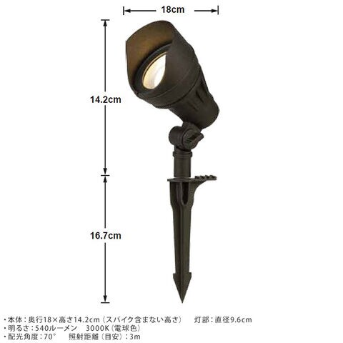 消費電力:13.3W 明るさ:540ルーメン 配光角度:70度 照射距離(目安):3m LED交換不可 スパイク付属 防雨型 別売りマウント使用可