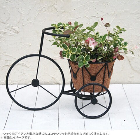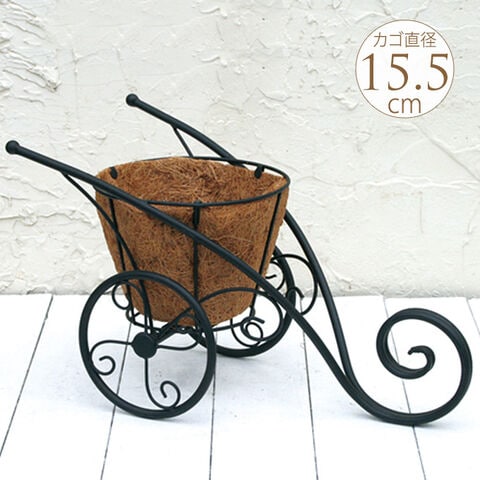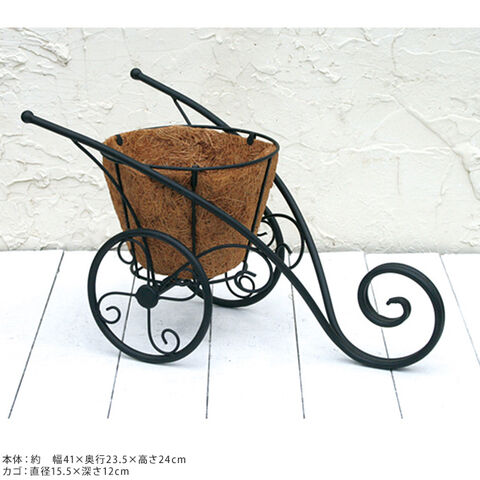 備考:アイアンの手押し車が可愛く、ココヤシのポットが付いたアイアン花台。シックなアイアンと素朴な感じのココヤシマットが植物をより美しく演出します。