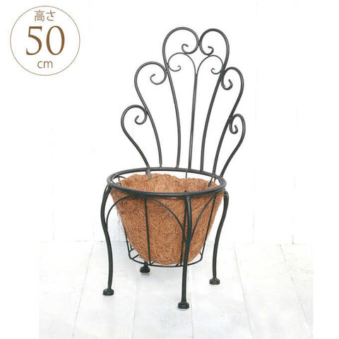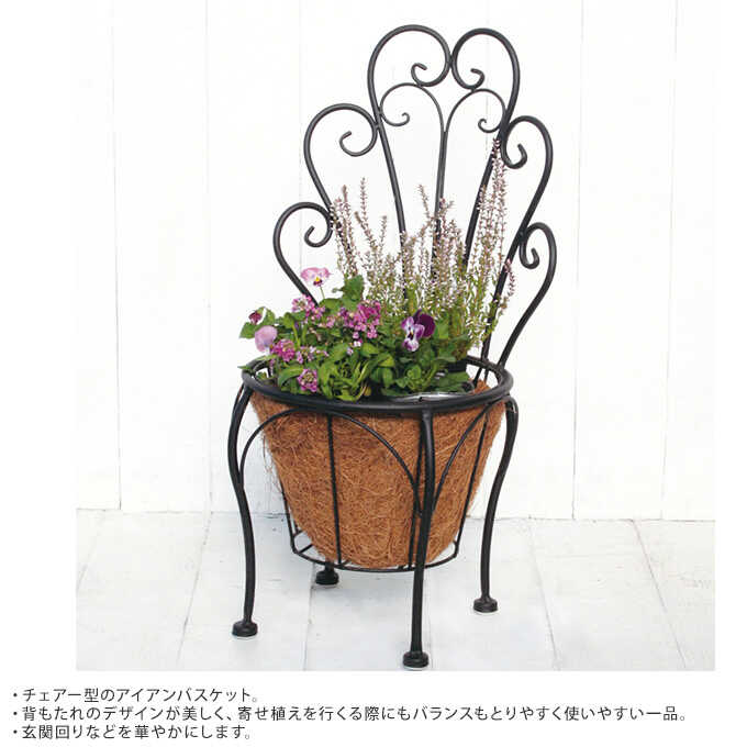 備考:チェアー型のアイアンバスケット。背もたれのデザインが美しく、寄せ植えを行くる際にもバランスもとりやすく使いやすい一品。玄関回りなどを華やかにします。