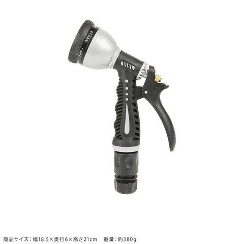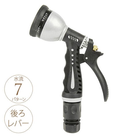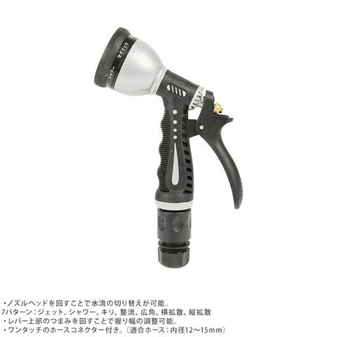備考:7パターン(ジェット、シャワー、キリ、整流、広角、横拡散、縦拡散)の水流切替が可能なメタルボディの散水ノズル。レバー上部のつまみを回すことで握り幅の調整も可能です。