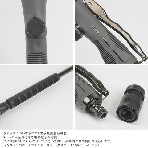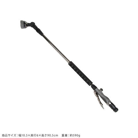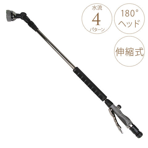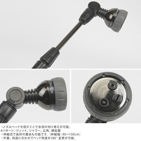 備考:4パターン(ジェット、シャワー、広角、横拡散)の水流切替が可能な散水ノズル。作業、用途に合わせてヘッド角度の変更も可能。(180°)グリップについてるツマミで水量調整も可能で、継続通水用のストッパー金具付き。伸縮式なので高所の散水も楽々(伸縮幅:90~130cm)。