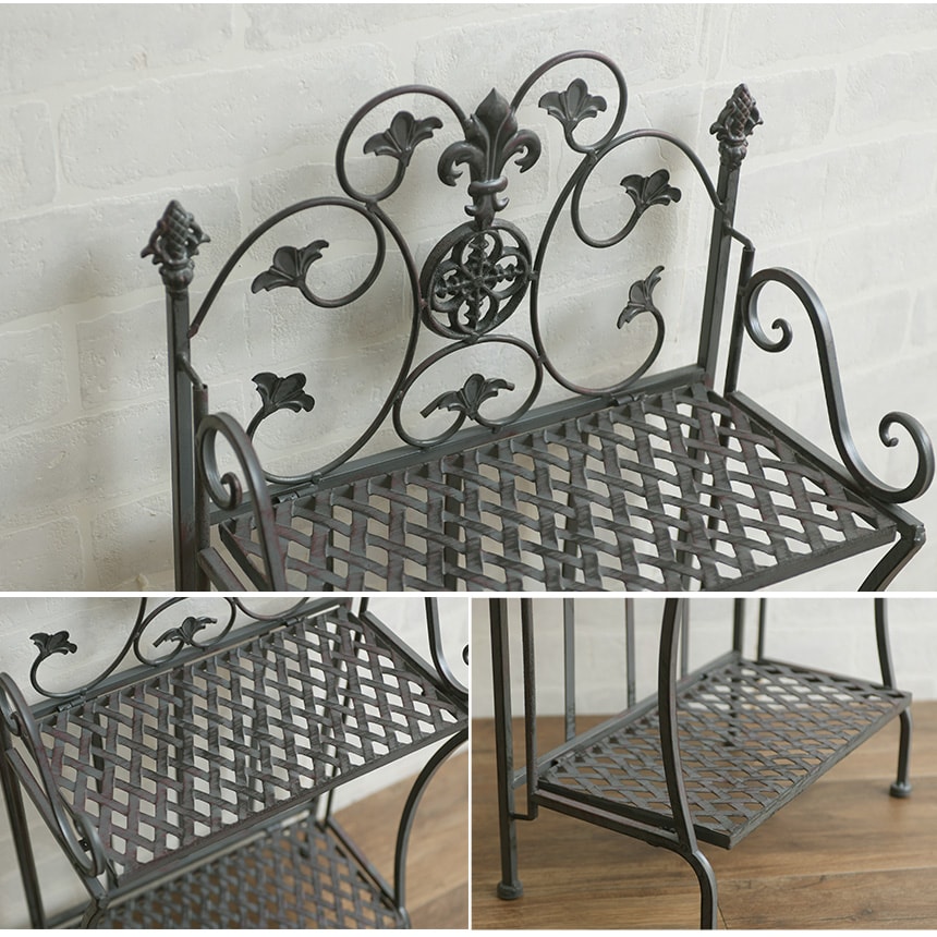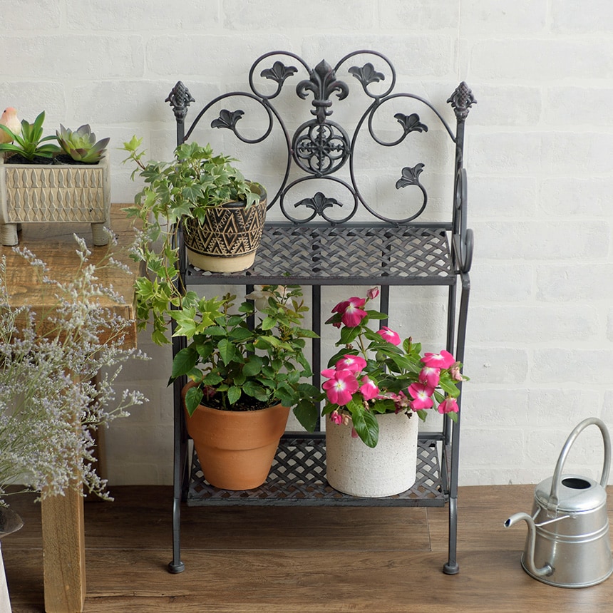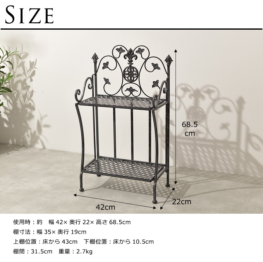 備考:コンパクトなサイズ感。植物引き立つアンティーク調のアイアン花台。 組立も簡単。折りたたんでる製品を広げて棚をはめるだけ。欧風なワイヤーデザインが飾る場所を豪華に演出します。アンティークな色合いが植物によく合います。
