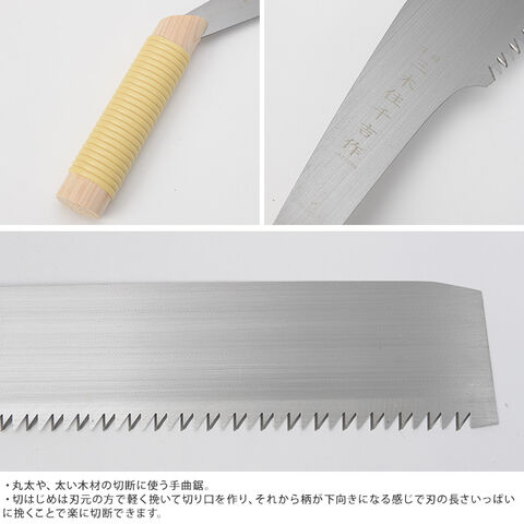 備考:丸太や、太い木材の切断に使う手曲鋸。切はじめは刃元の方で軽く挽いて切り口を作り、それから柄が下向きになる感じで刃の長さいっぱいに挽くことで楽に切断できます。ログハウスなどの製作時や、太枝の剪定後のカットに。